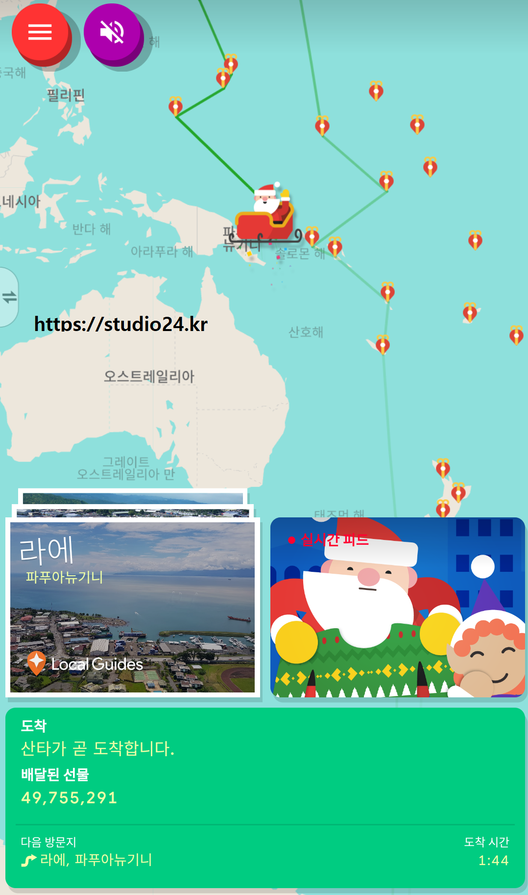 구글에서는 실시간으로 어느 지역, 다음 방문지, 배달된 선물이 확인됩니다.