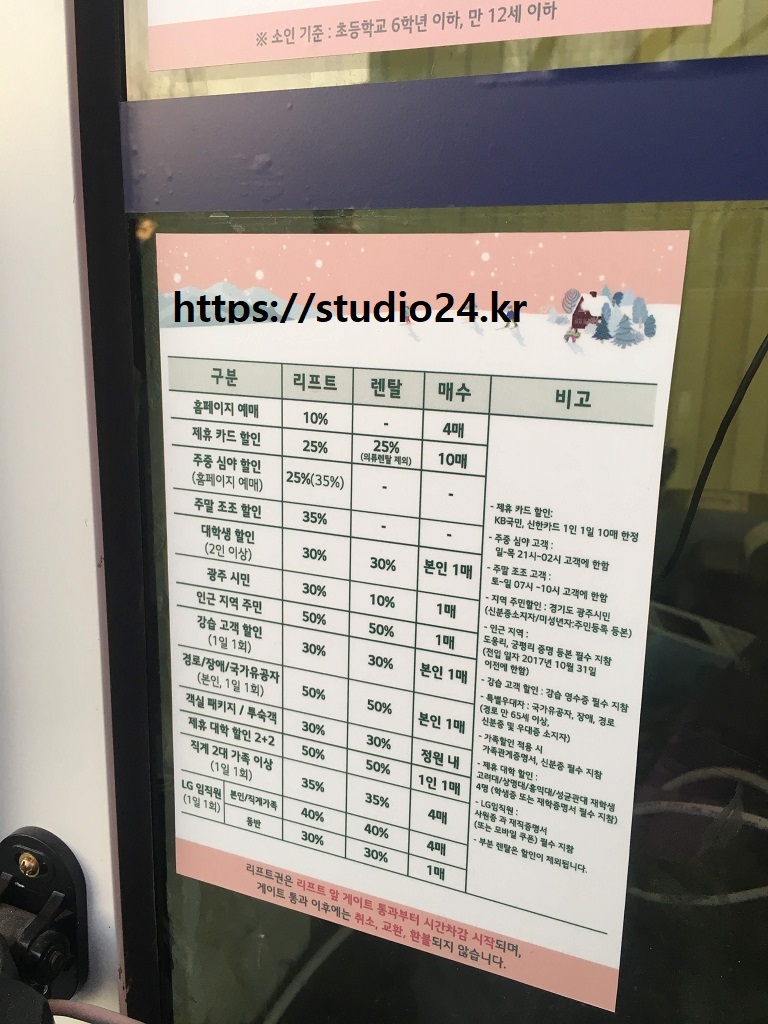 리프트권 구입 창구에서 보니 할인 내용과 금액이 잘 설명되어 있습니다.