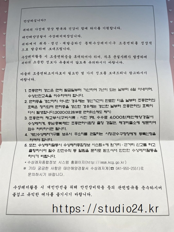 충북지역을 담당하는 태안 해양경찰서 교통 레저계에서 자격증을 발송해 주었어요.