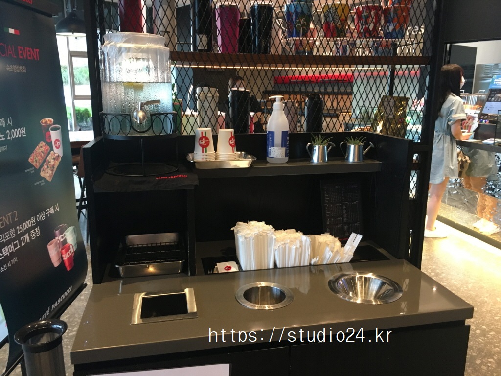 일회용 컵, 손 소독용품 잘 구비되어 있네요.