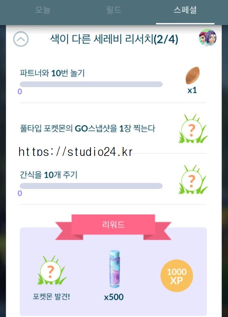 포켓몬고 색이 다른 세레비 리서치를 완료했습니다.