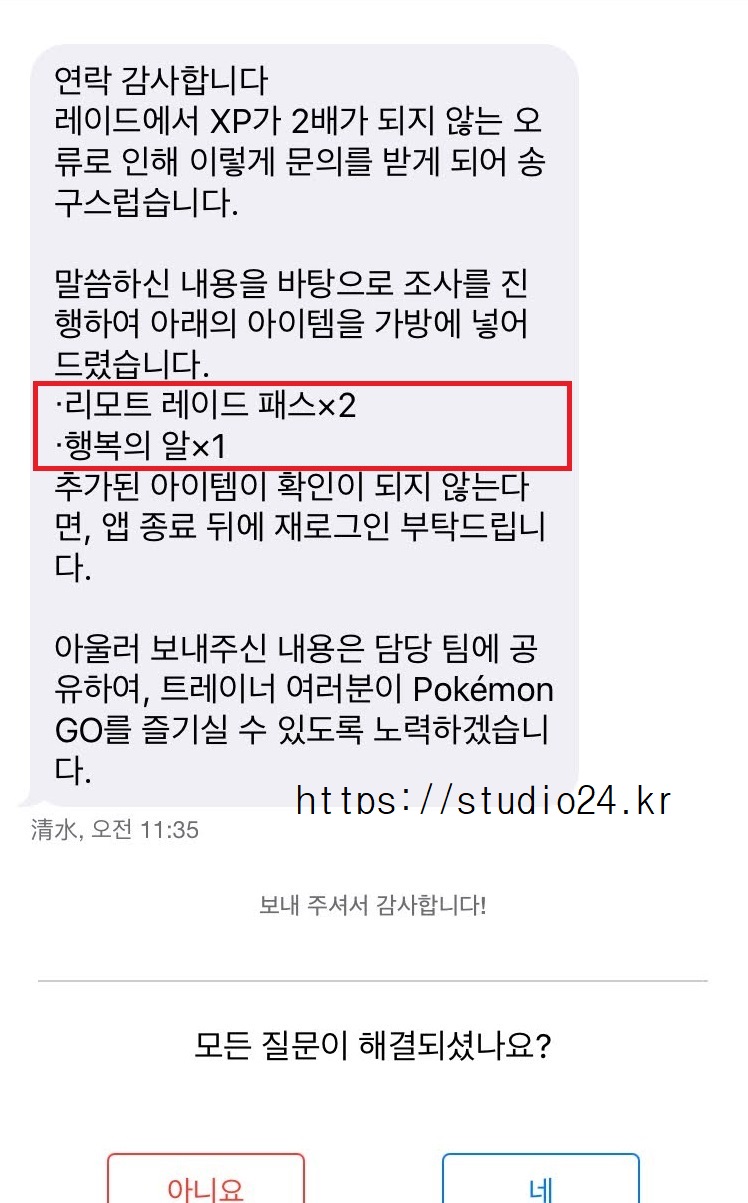 복구 내용은 레이드 패스 2개, 행복의 알 1개