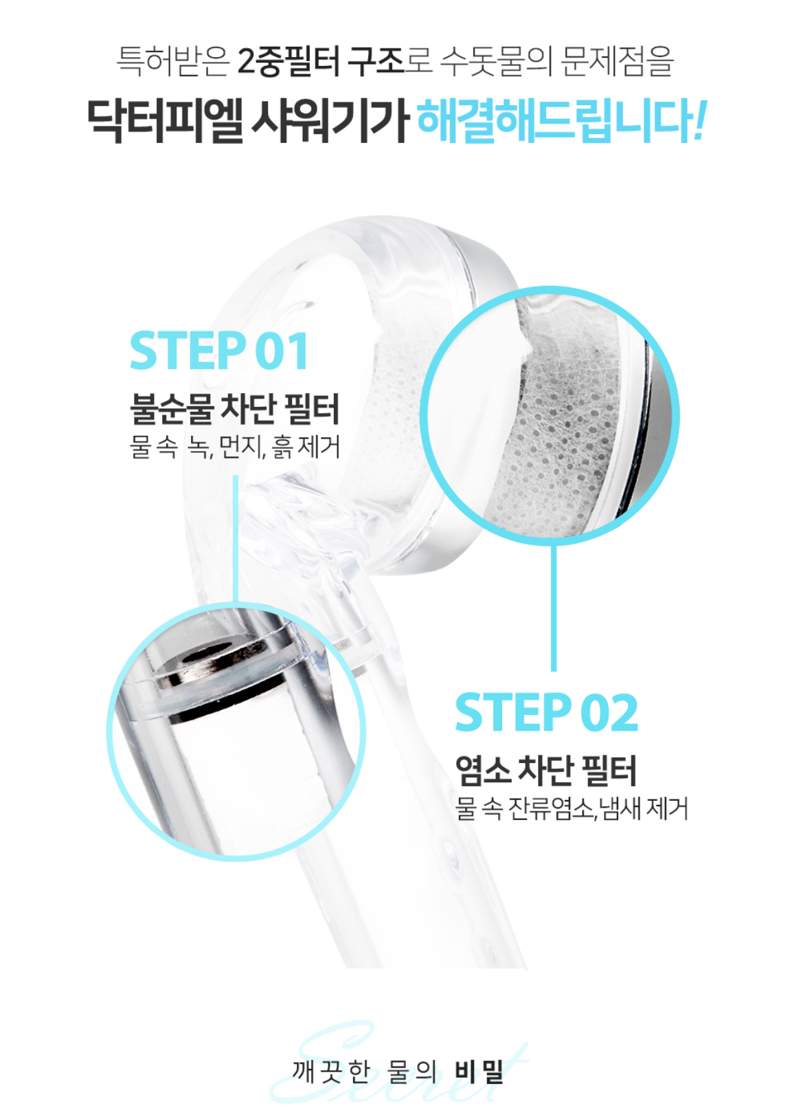 샤워기의 경우 불순물 차단 필터와 염소 차단 필터 2중 구조로 되어 있었어요.