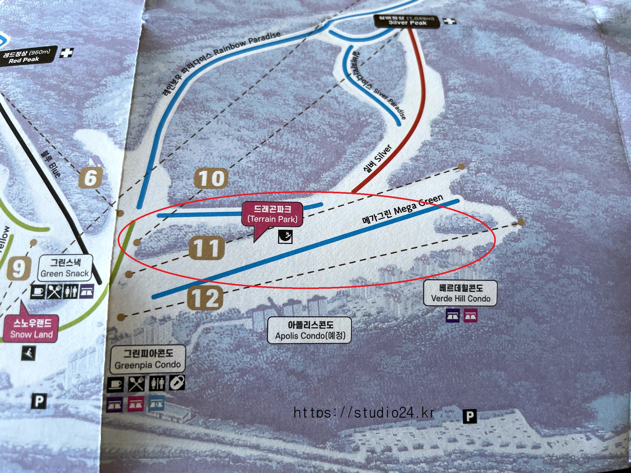 그린피아콘도에서 바로 나가면 메가그린 슬로프입니다.