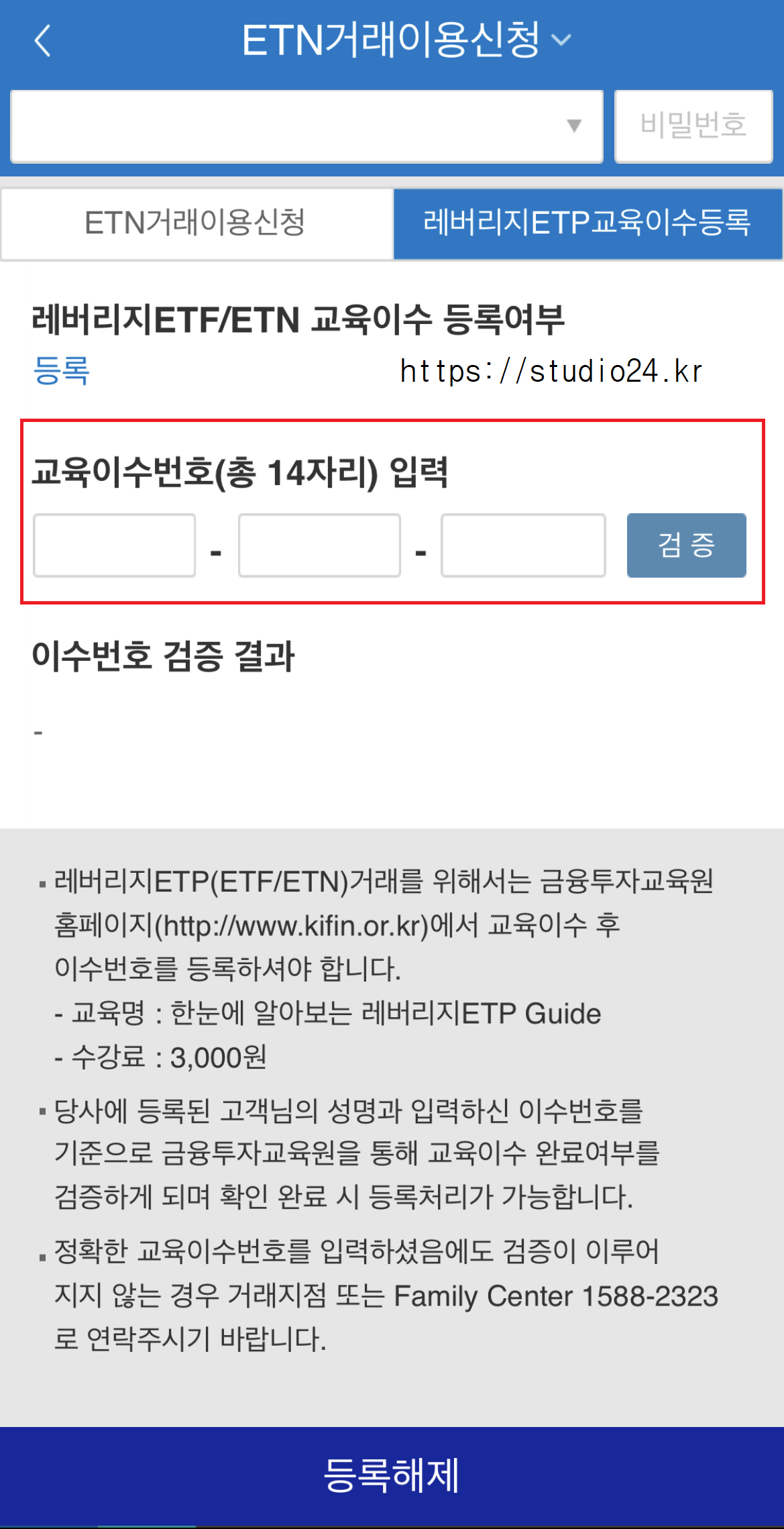 레버리지 ETP(ETF/ETN) 거래를 위해서는 금융투자 교육원에서 교육 이수를 해야 합니다.