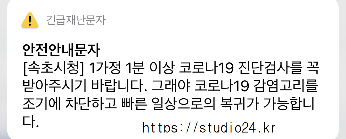 1가정 1분 이상 코로나19 진단 검사를 꼭 받아 달라는 재난문자가 와서 다녀왔어요.