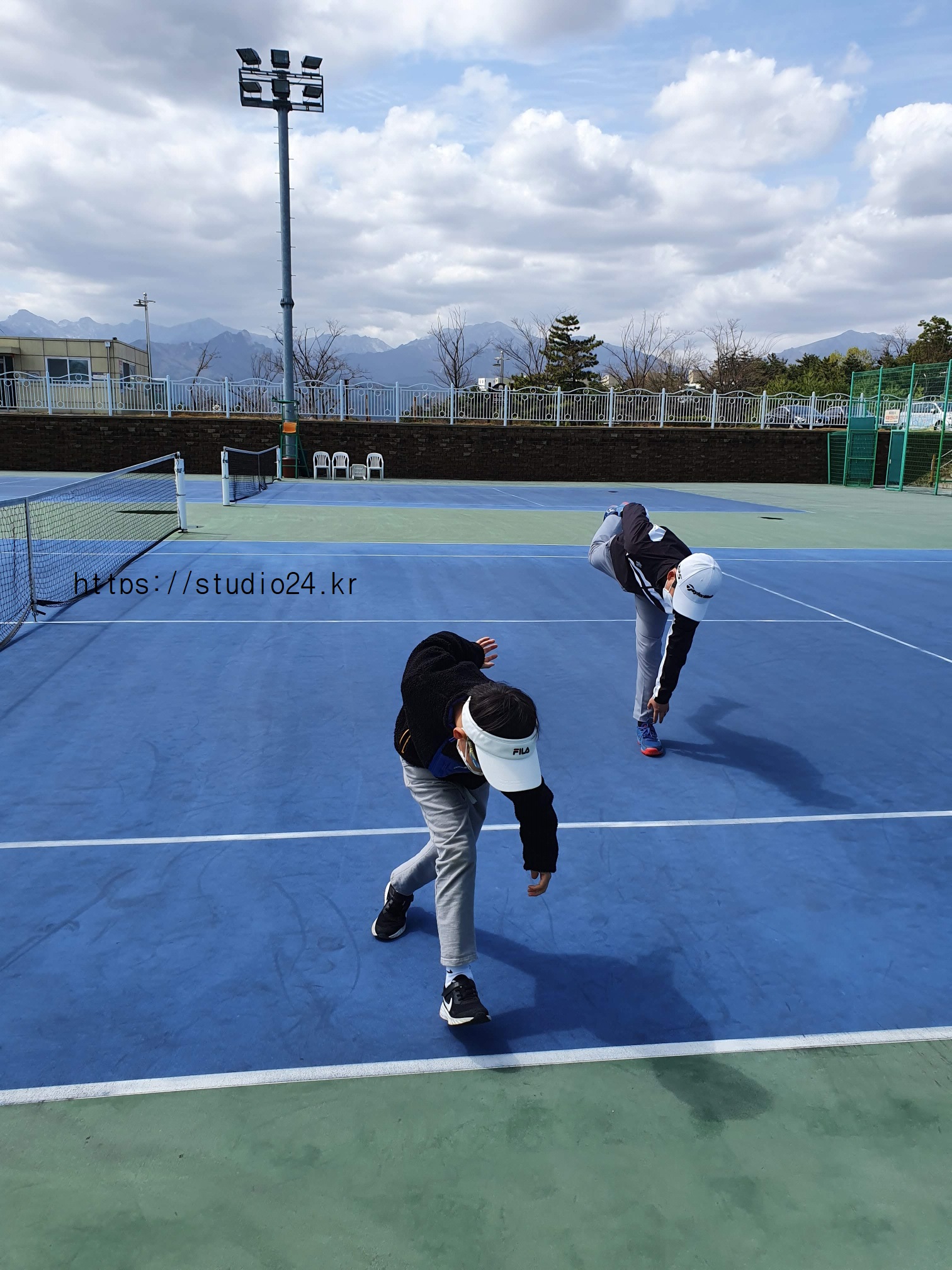 아들과 테니스 운동하기 전 몸풀기를 먼저 했습니다.