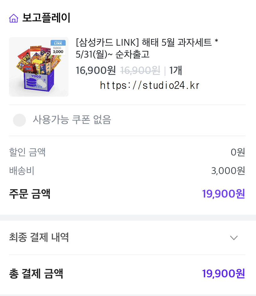 삼성카드 LINK 혜택 VOGO에서 해태 과자세트를 3천원에 구입할 수 있습니다.