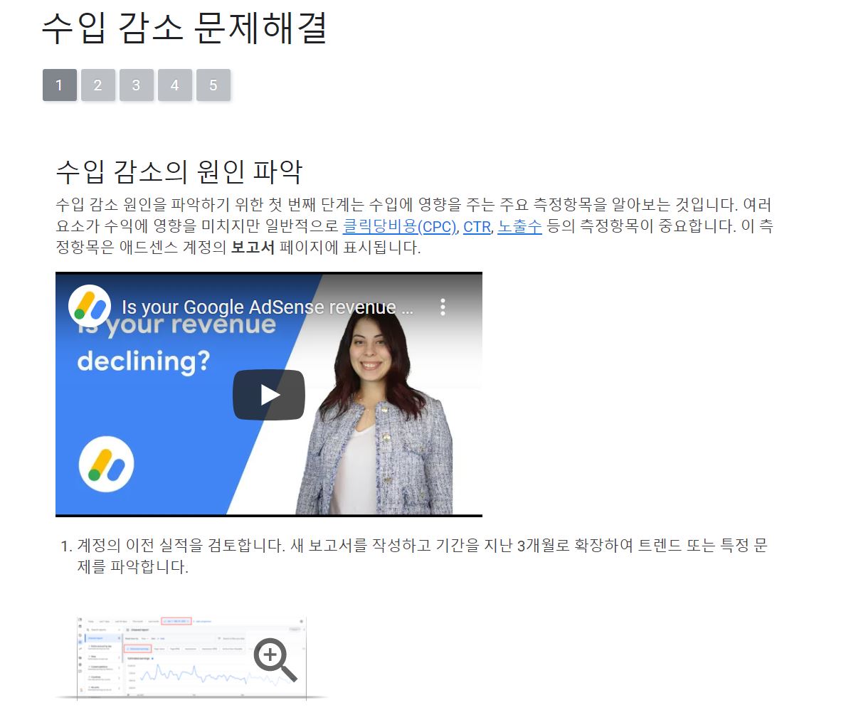 구글 애드센스에서 알려주는 수입 감소 문제 해결방법입니다.