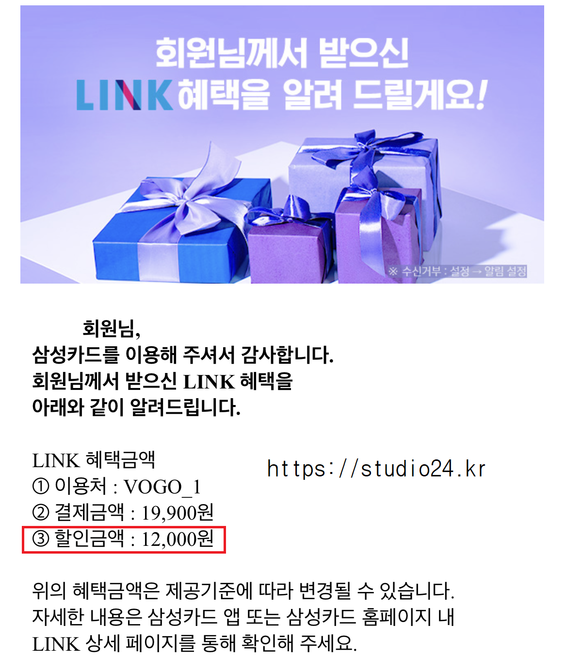 잠시 후 LINK 할인 혜택이 알람으로 도착합니다.