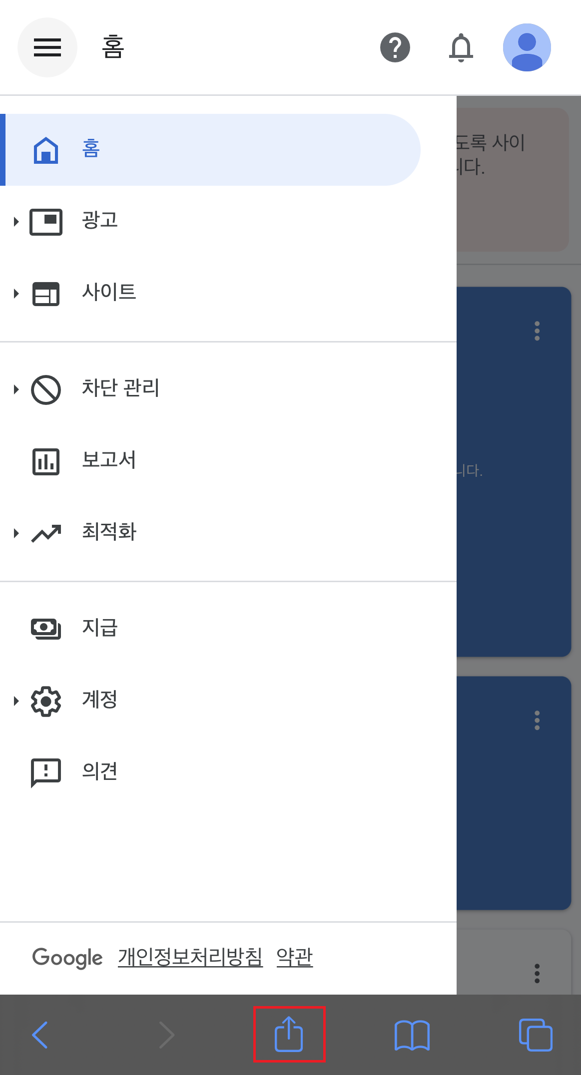 애드센스 홈페이지 접속 -> 하단 공유 버튼 클릭 -> 홈 화면에 추가 클릭하면 끝!