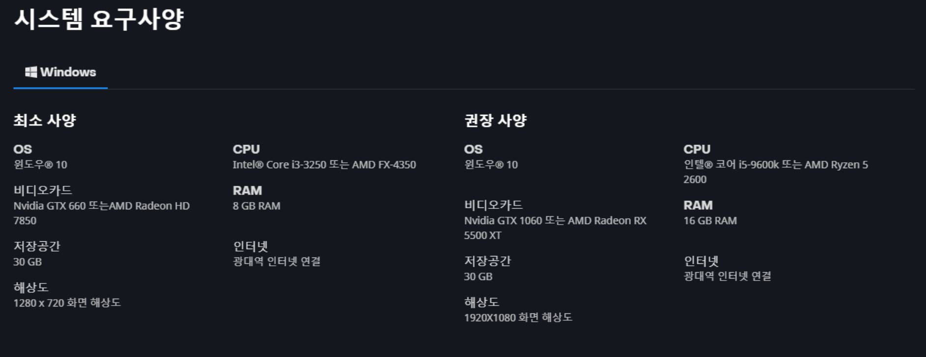 권장사양은 I-5, GTX1060, AMD 5500XT
