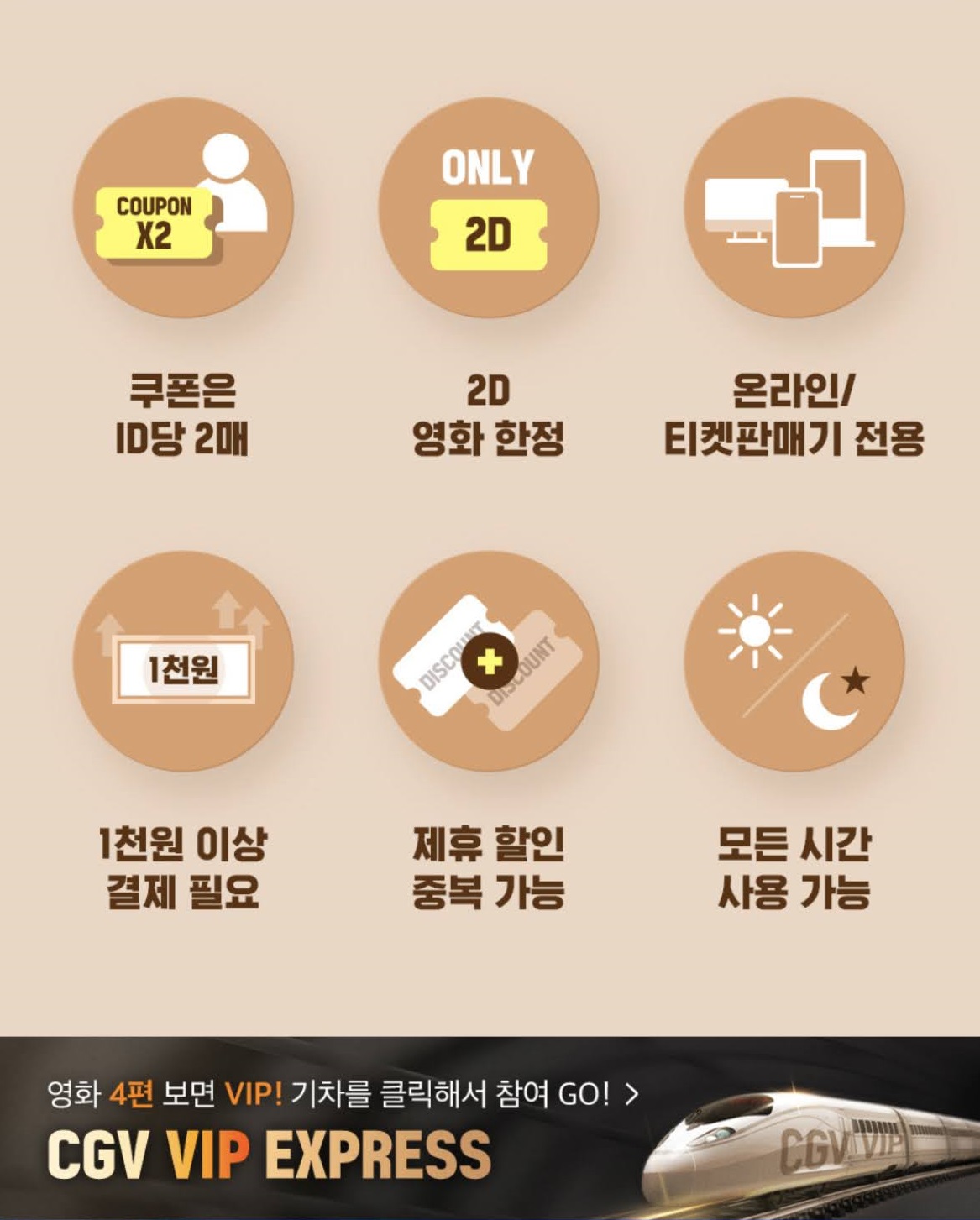 쿠폰 다운하시고, 일주일에 두 번 영화를 관람하신 후 차주에 두번 관람하시면 됩니다.