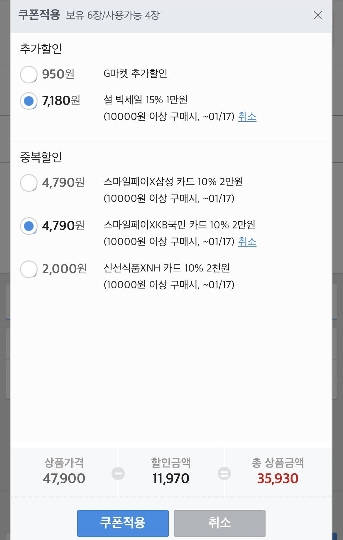 쿠폰 적용 및 KB국민카드 등록해서 할인받았어요.