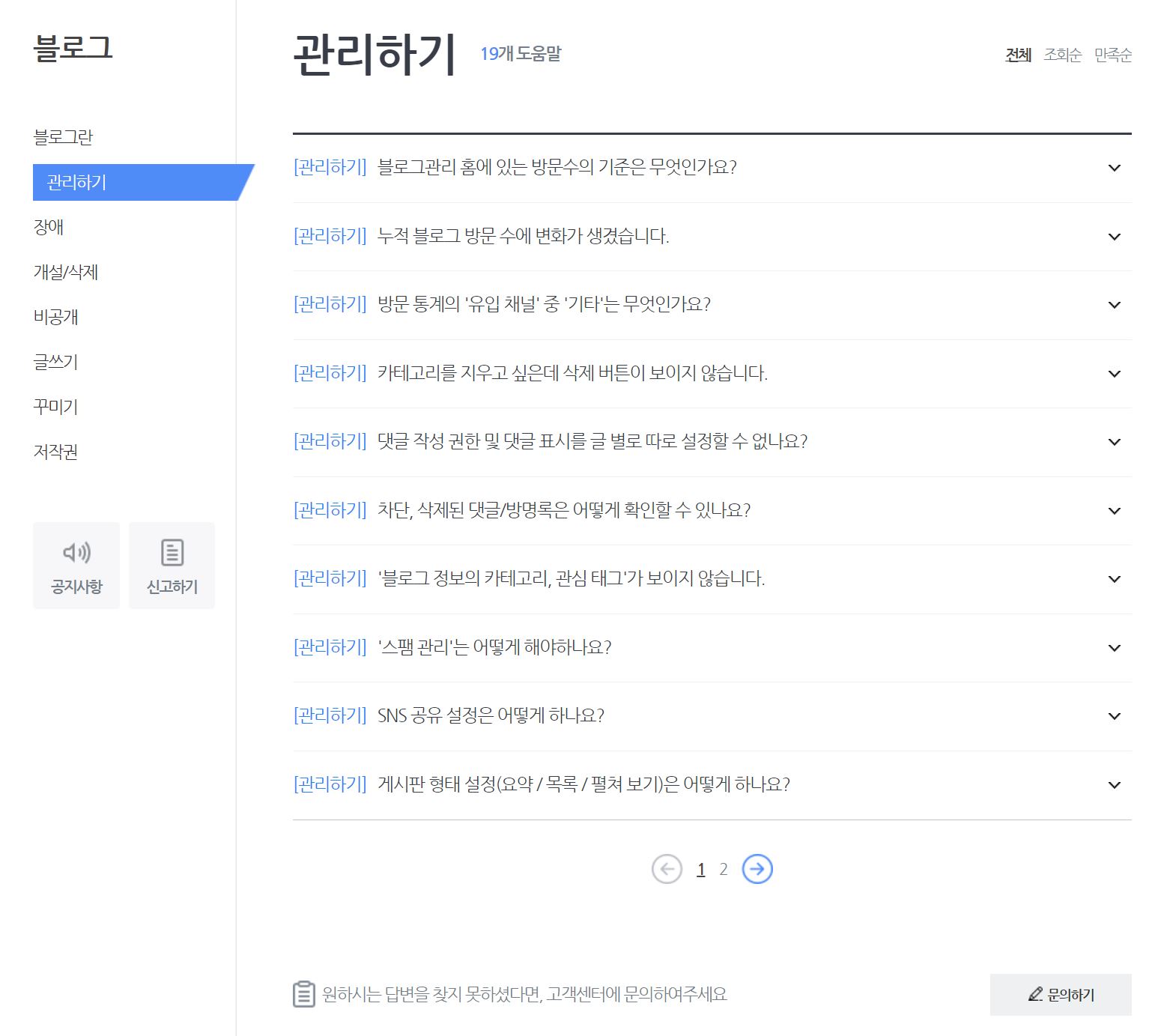 두번째 방법은 문의하기에서 검색 -> 검색 결과 미노출