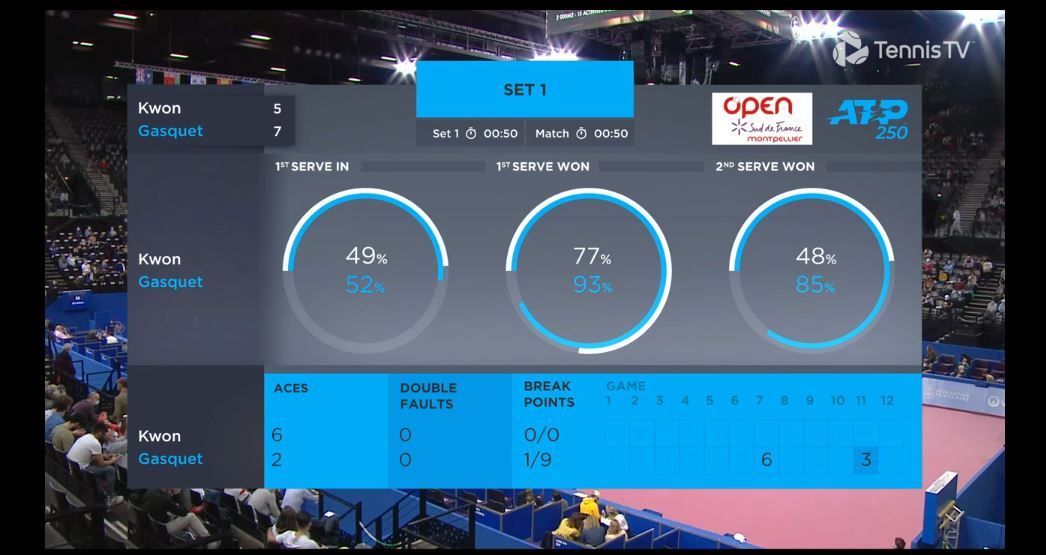 한 차례도 브레이크 기회를 잡지 못했고, 가스케 선수의 서브가 상당히 강해 보였습니다.