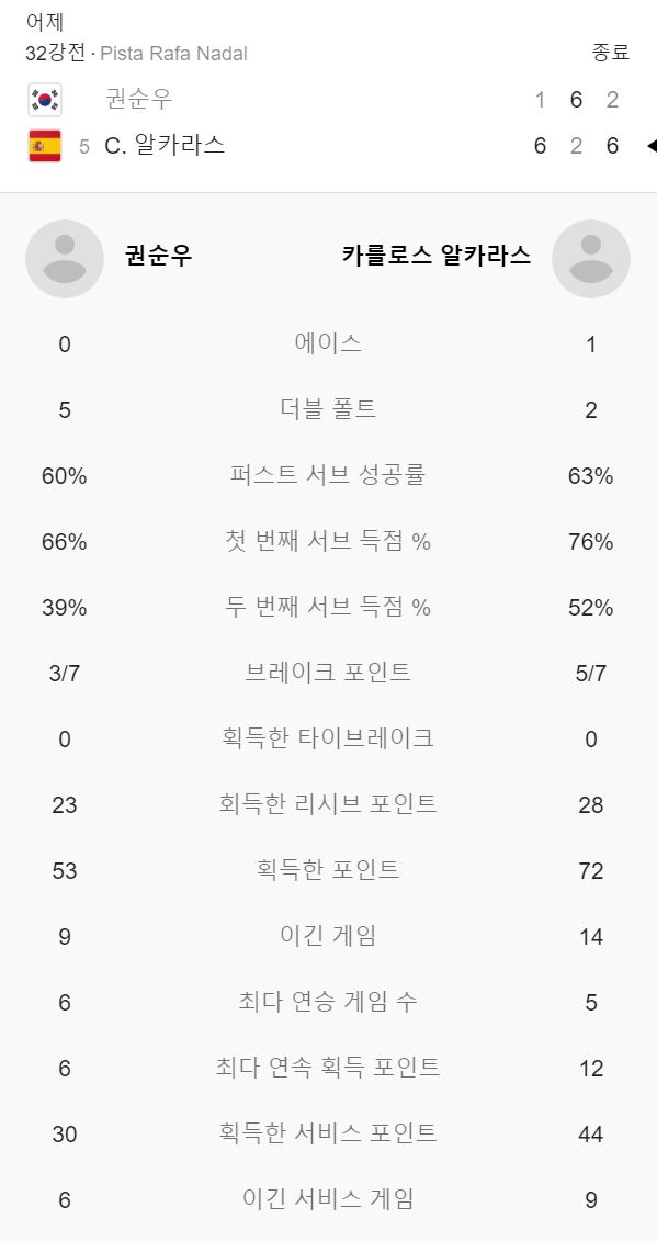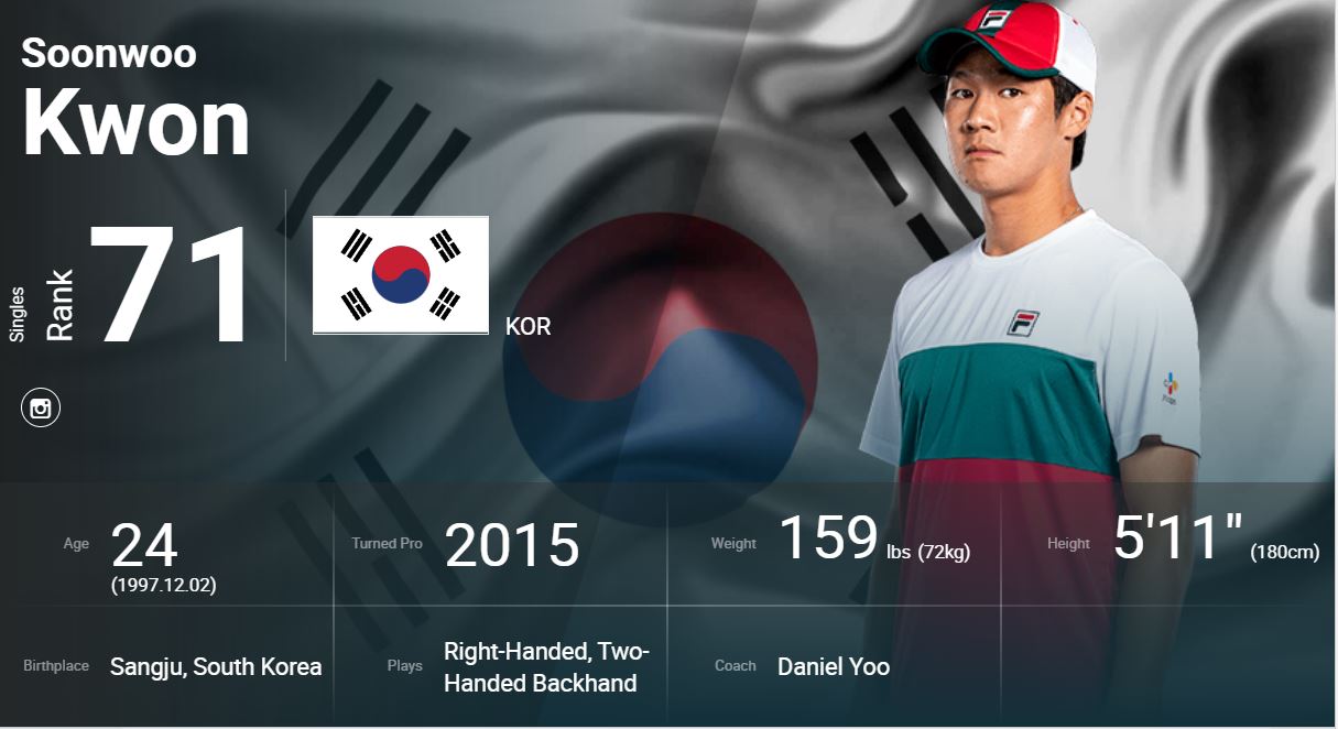 세계 11위 카를로스 알카라즈를 상대로 멋진 경기를 했던 권순우 선수입니다.
