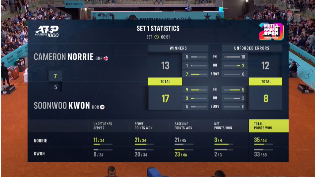 위너는 권순우 선수가 확실히 높았지만, 실수가 많았습니다.