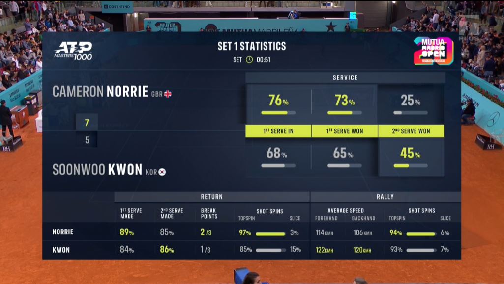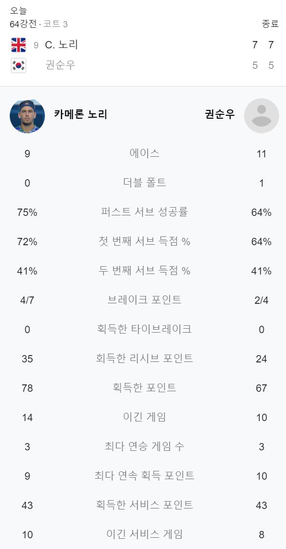 권순우 선수가 예전에 노리 선수와 연습 랠리를 뛰고 서로 장점과 단점을 잘 알고 있는 사이라고 합니다.