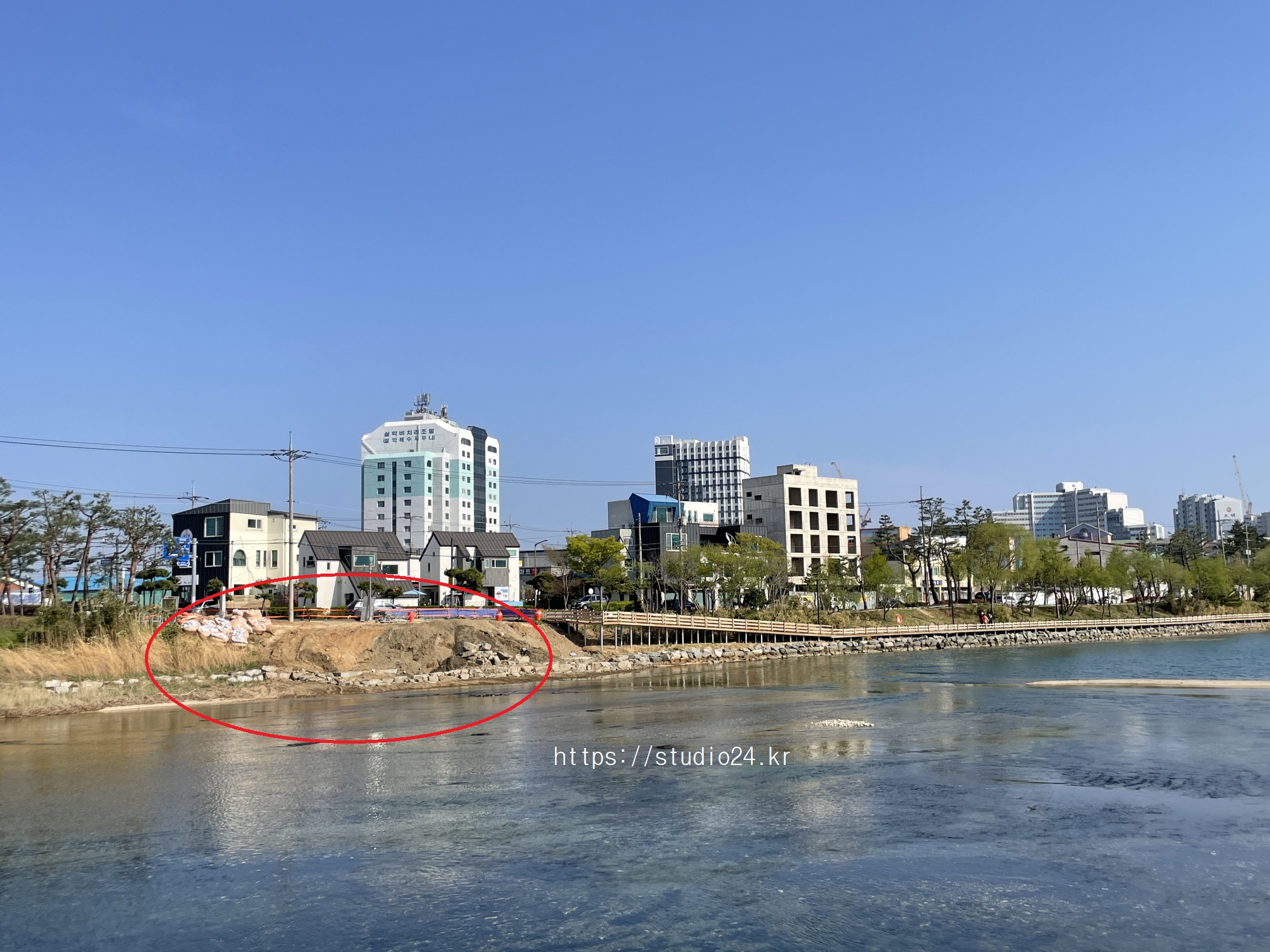 바다와 강의 흐름을 막고 공사가 되고 있어 부유물이 많이 떠다니고 있어요.