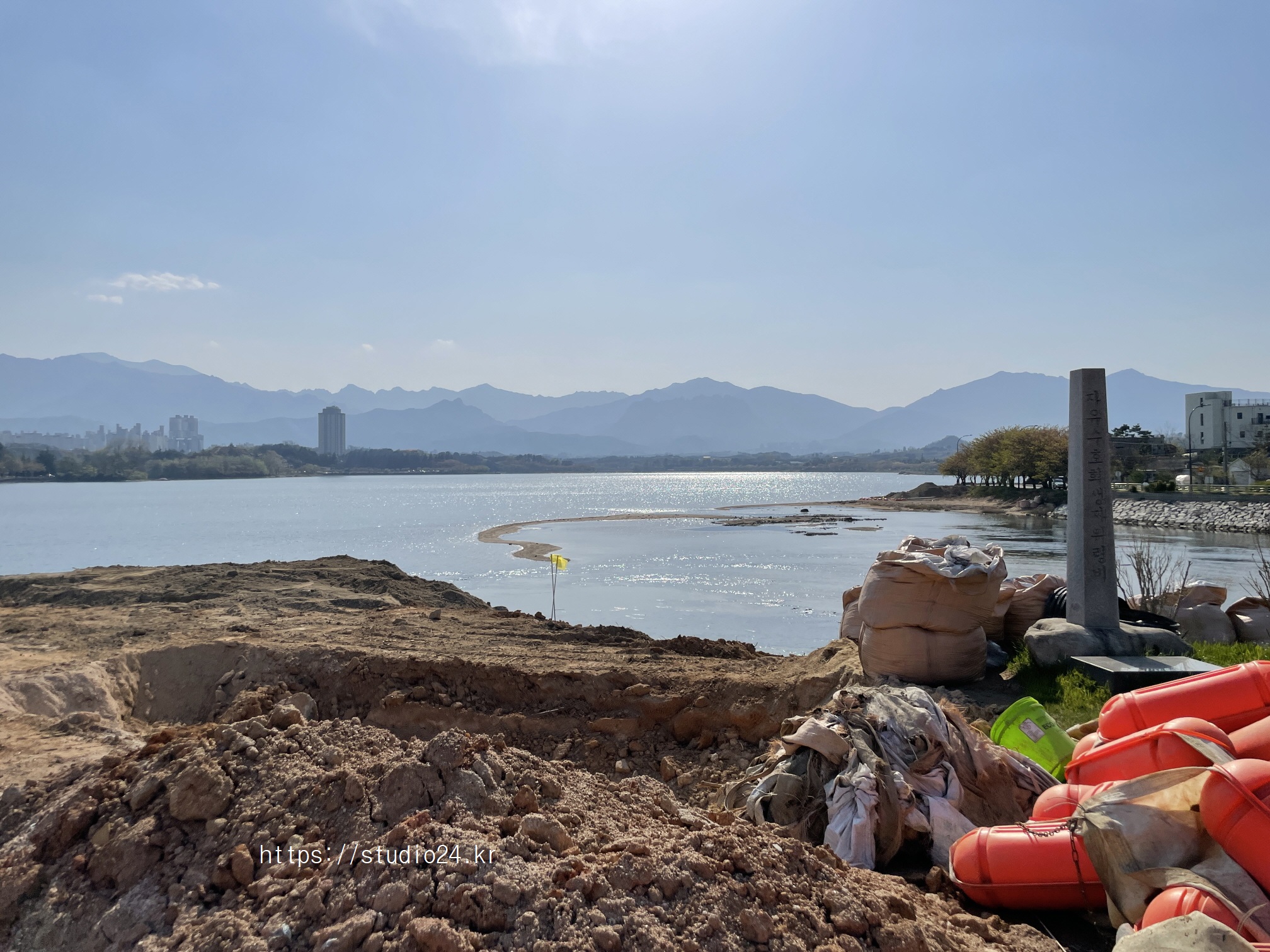 바다와 강의 흐름을 막고 공사가 되고 있어 부유물이 많이 떠다니고 있어요.