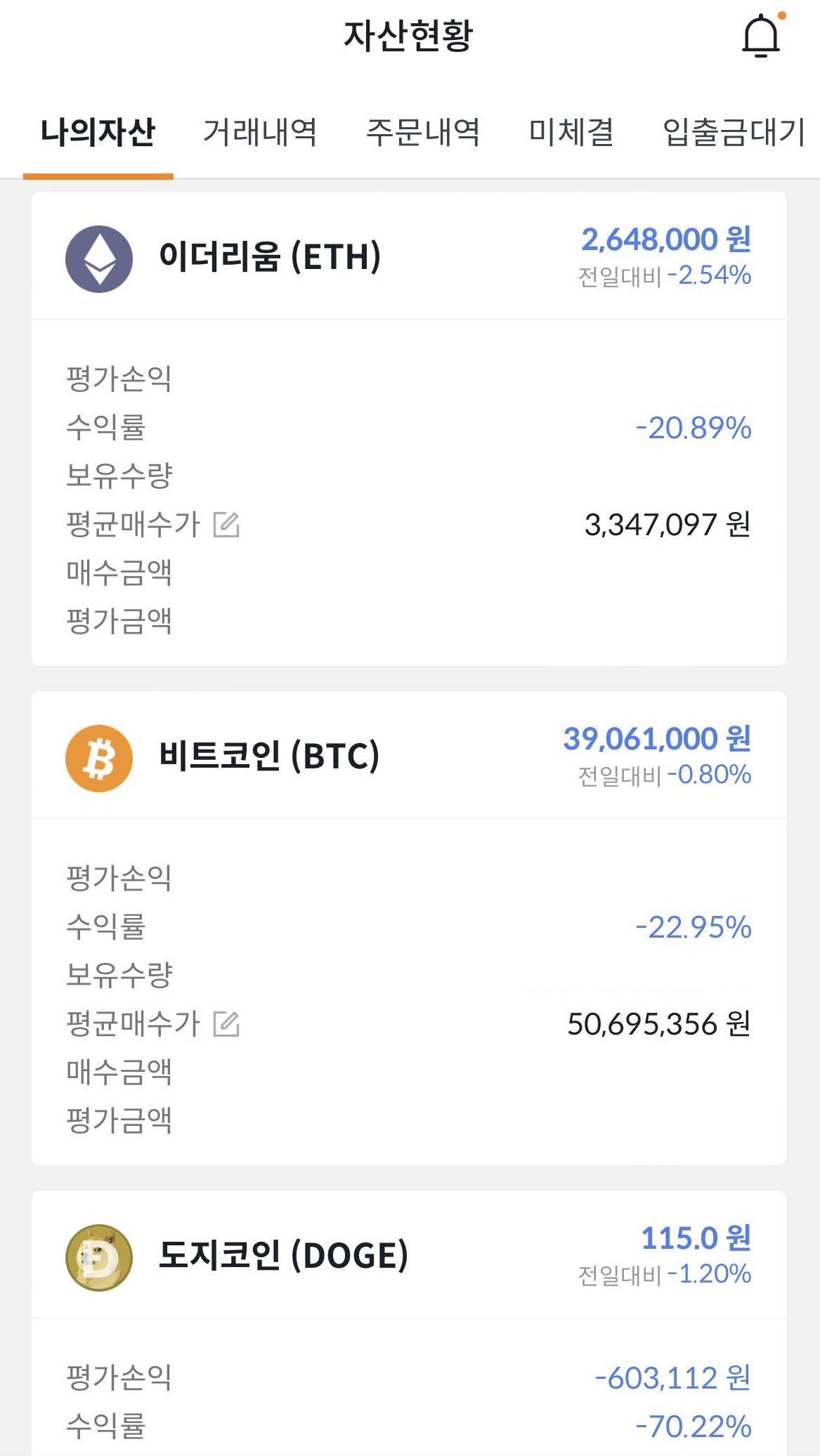 내가 보유한 코인은 어떻게 되었나 확인해 보았습니다.
