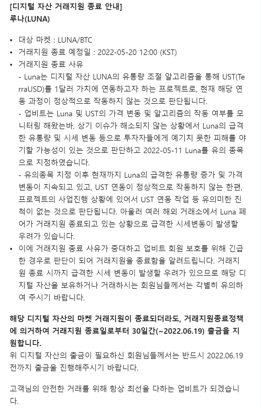 그래서 급하게 쿠나 코인은 거래 종료가 예정되었습니다.