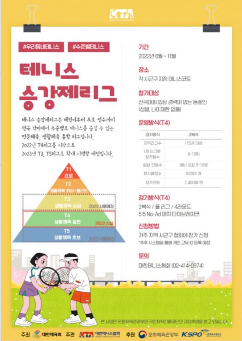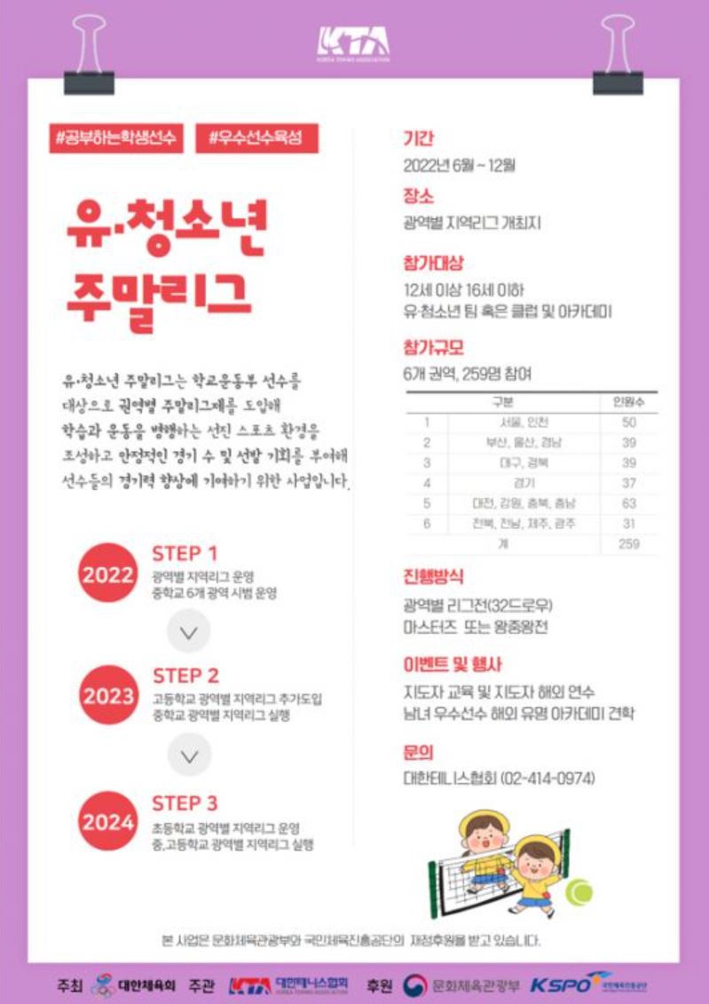 대한테니스협회, 프로-아마추어 통합형 리그제 시행 첫걸음! 김예현 2022년 승강제리그, 유·청소년 클럽리그, 유·청소년 주말리그 등 대형 공모 사업 3종 동시 선정 전문체육, 생활체육 통합형