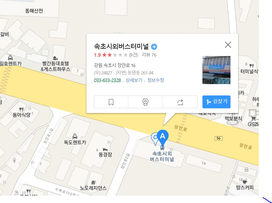 시외버스터미널의 경우 속초항, 동명항을 걸어 갈 수 있음