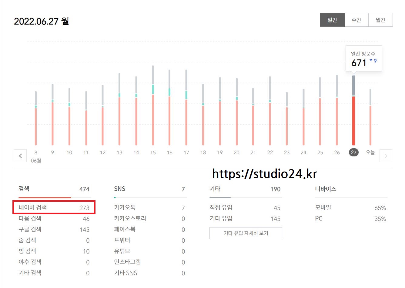 일간 방문자수를 확인해 보면 671