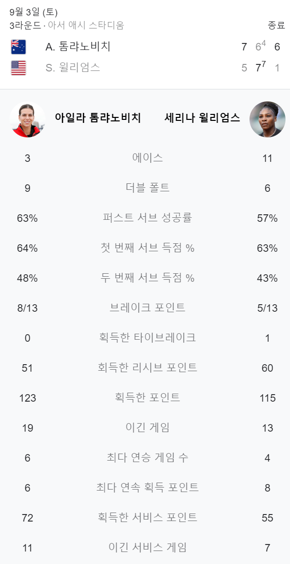 경기는 9월 3일 토요일에 진행되었고 상대 선수는 A.톰랴노비치입니다.