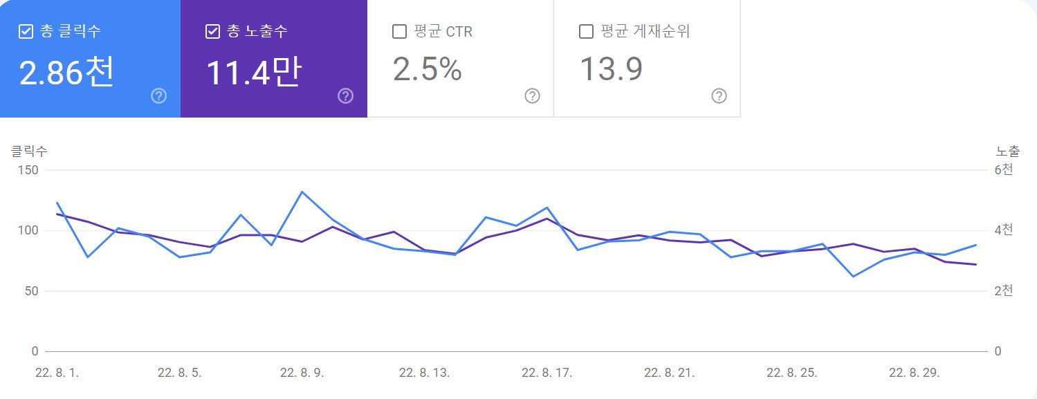07월과 비교하면 총 클릭수가 감소하고 총 노출수는 증가되었습니다.