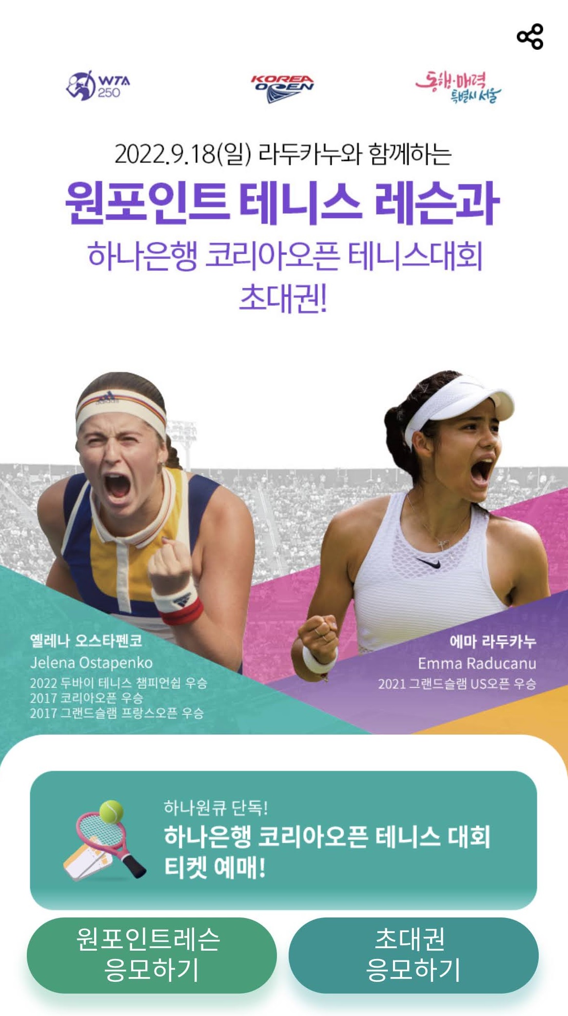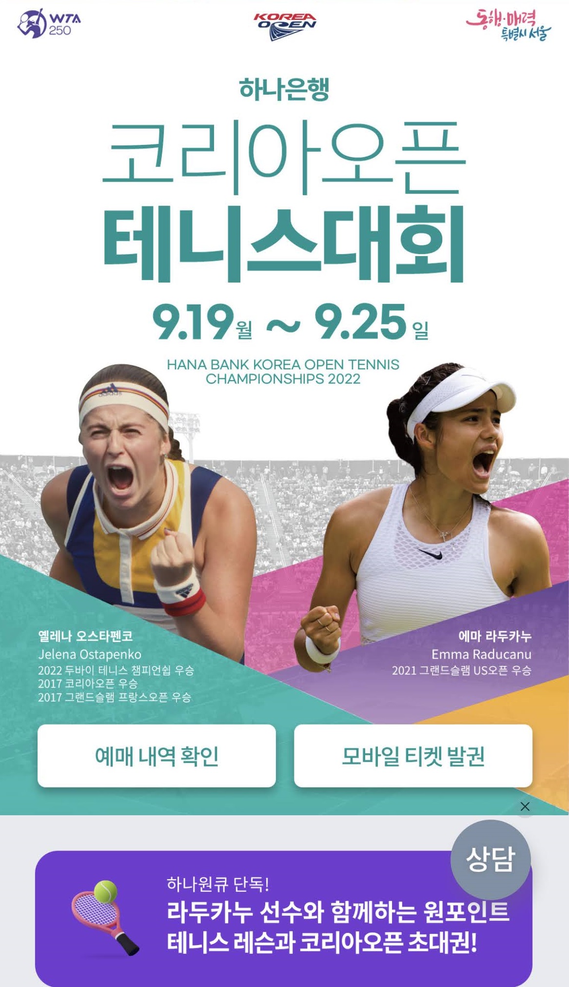 하나은행 코리아오픈 테니스 대회 예매는 하나은행 어플에서 예매가 가능했습니다.