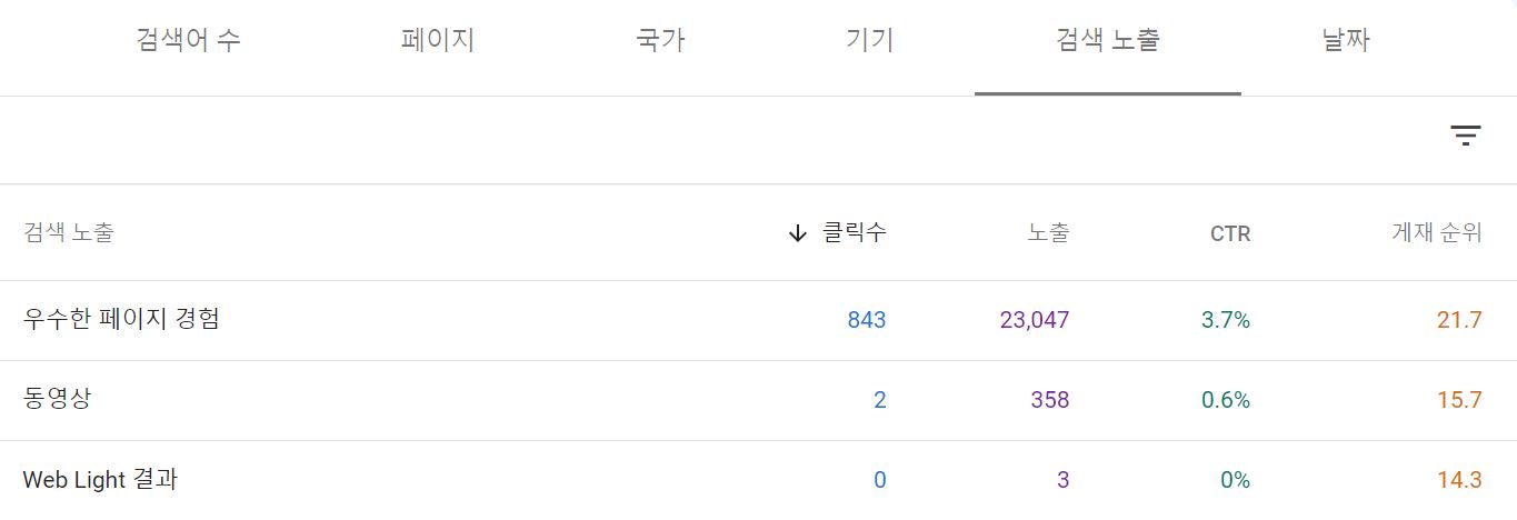 우수한 페이지 경험 클릭이 많이 감소했습니다.