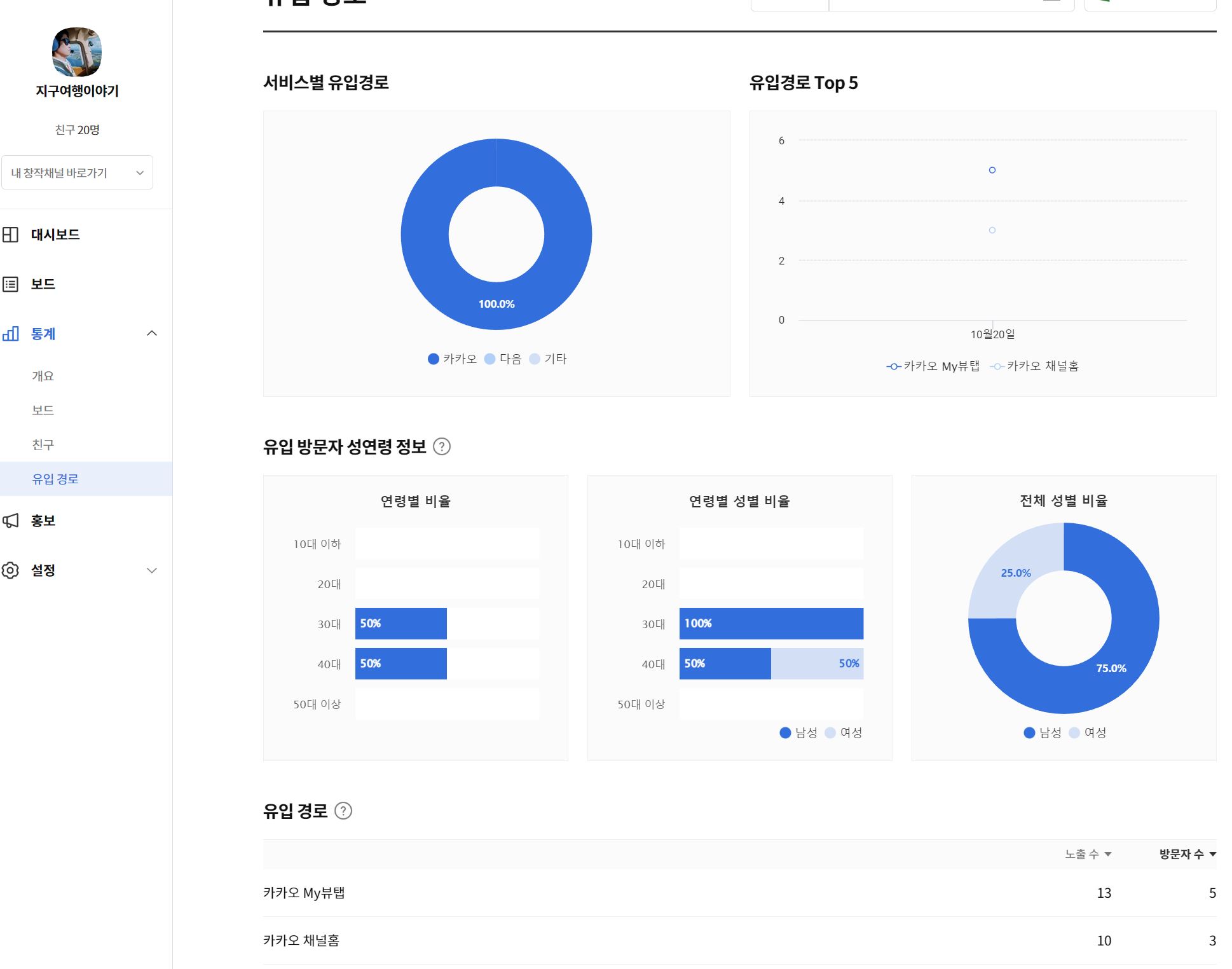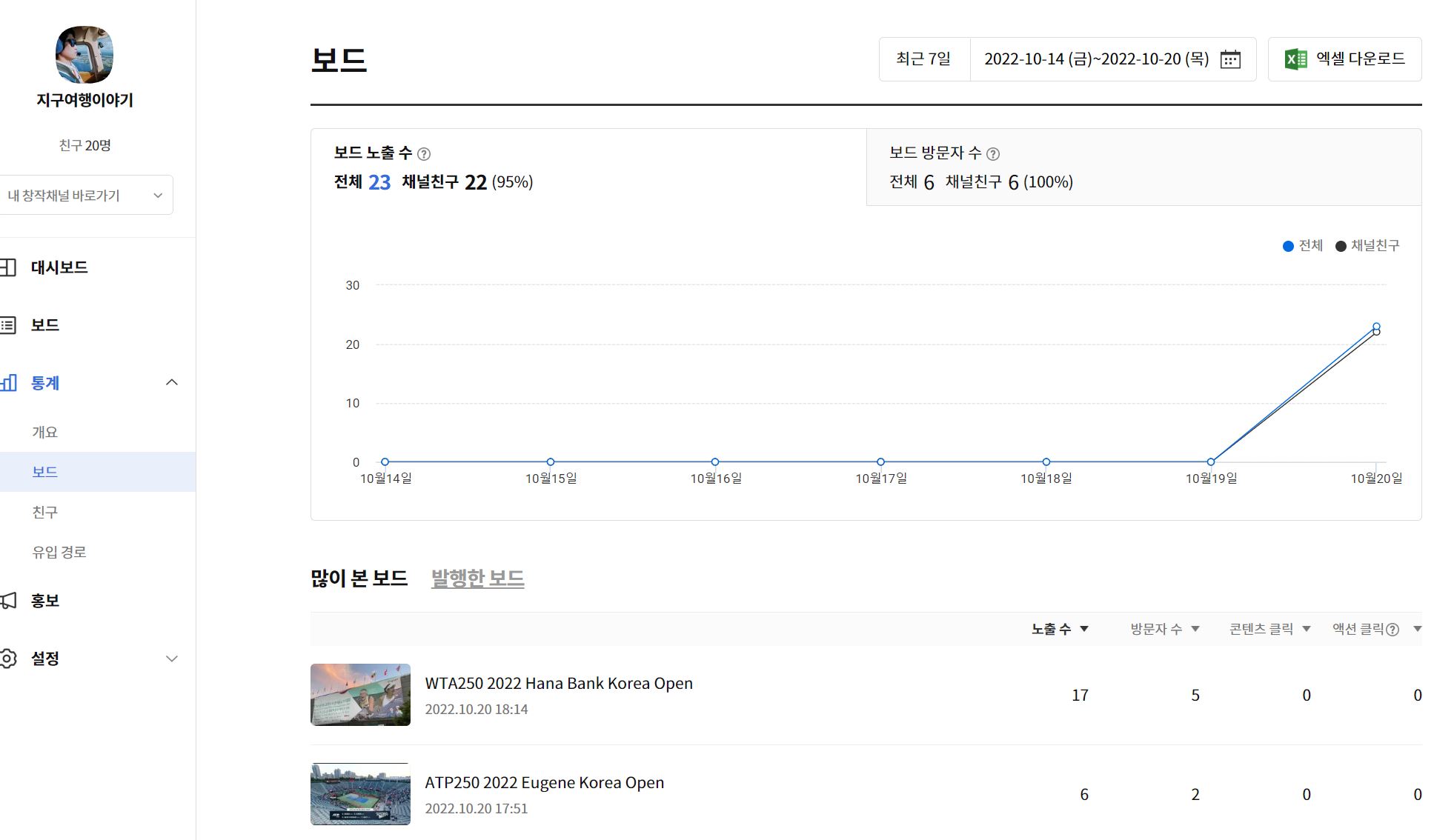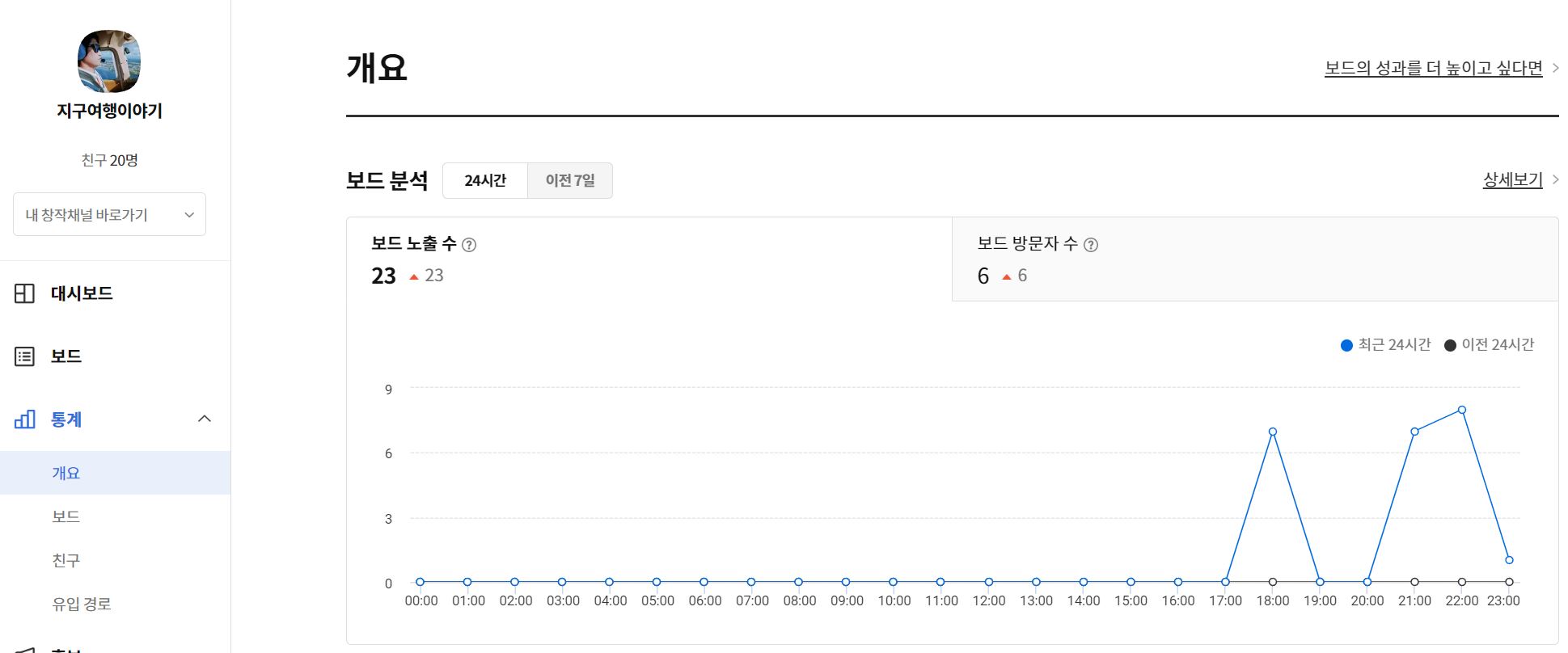 딱 하루 되었고, 보드 노출 수 23, 방문자 6, 채널 친구는 20명이 되었습니다.