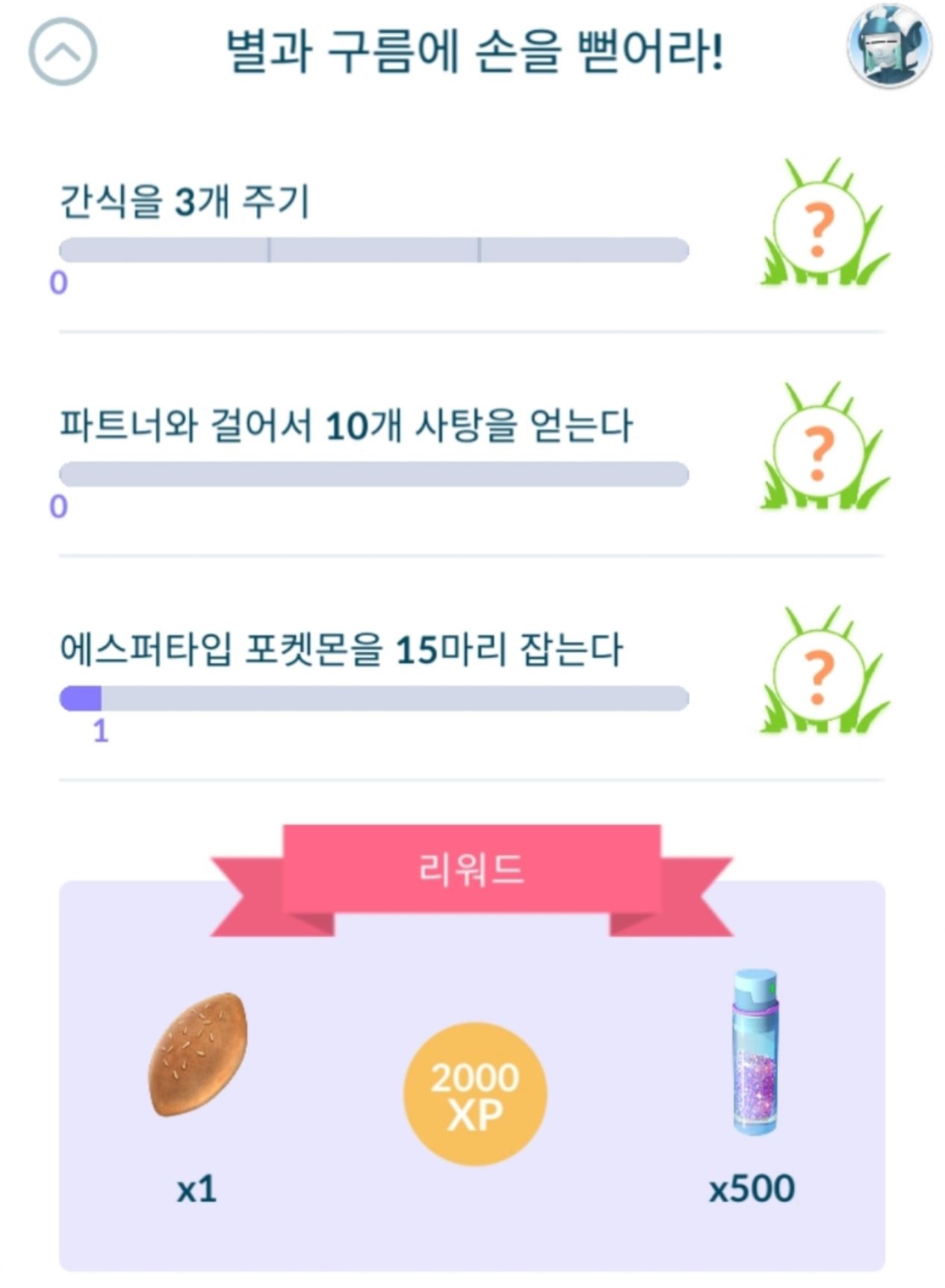 - 포켓몬 15마리를 잡는다 / 라즈열매 5개