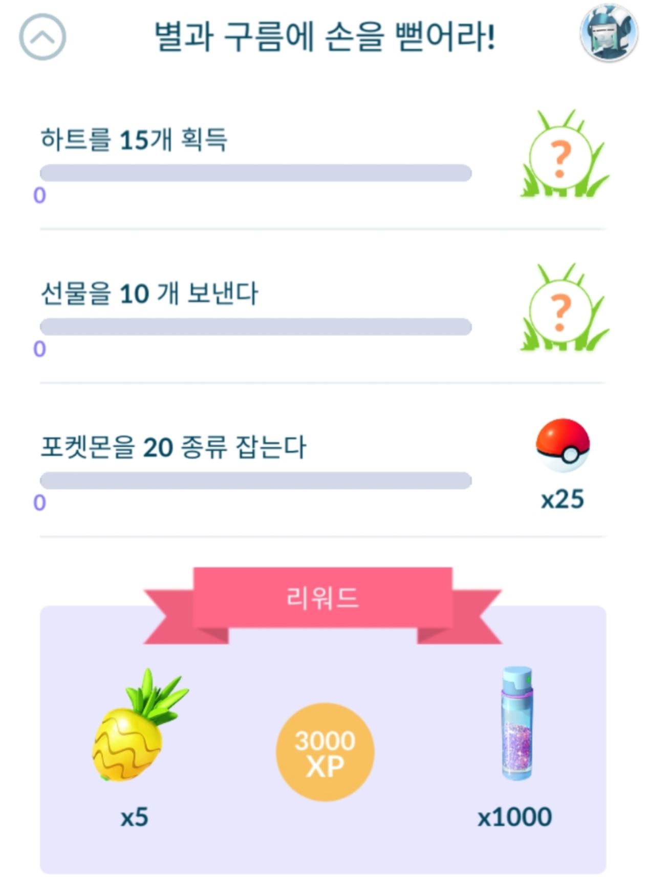 - 포켓몬 15마리를 잡는다 / 라즈열매 5개