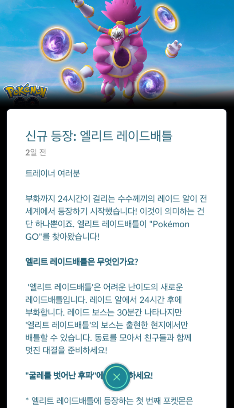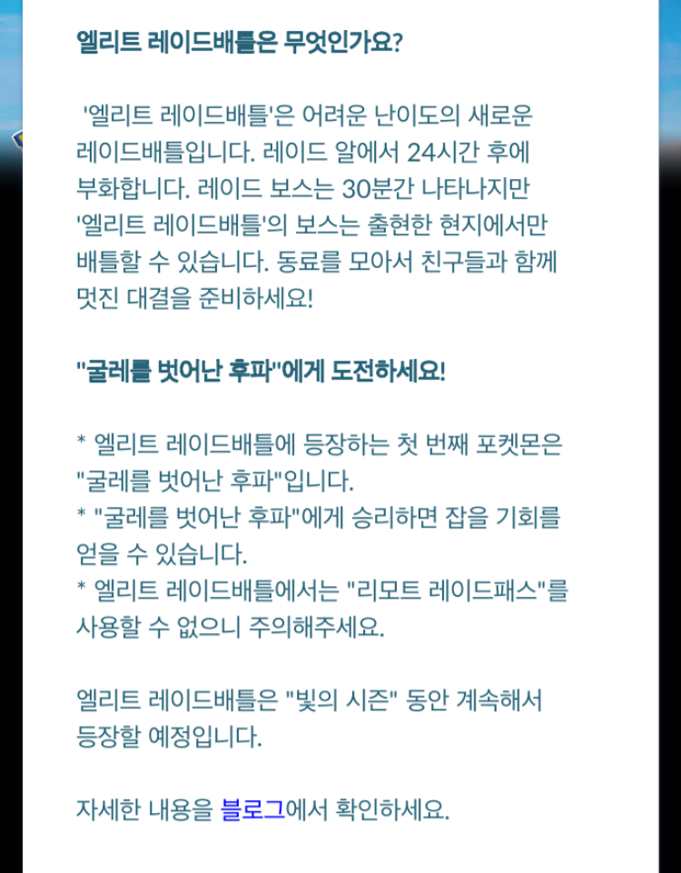 엘리트 레이드는 24시간 전 알이 발생, 30분 동안 레이드가 진행됩니다.