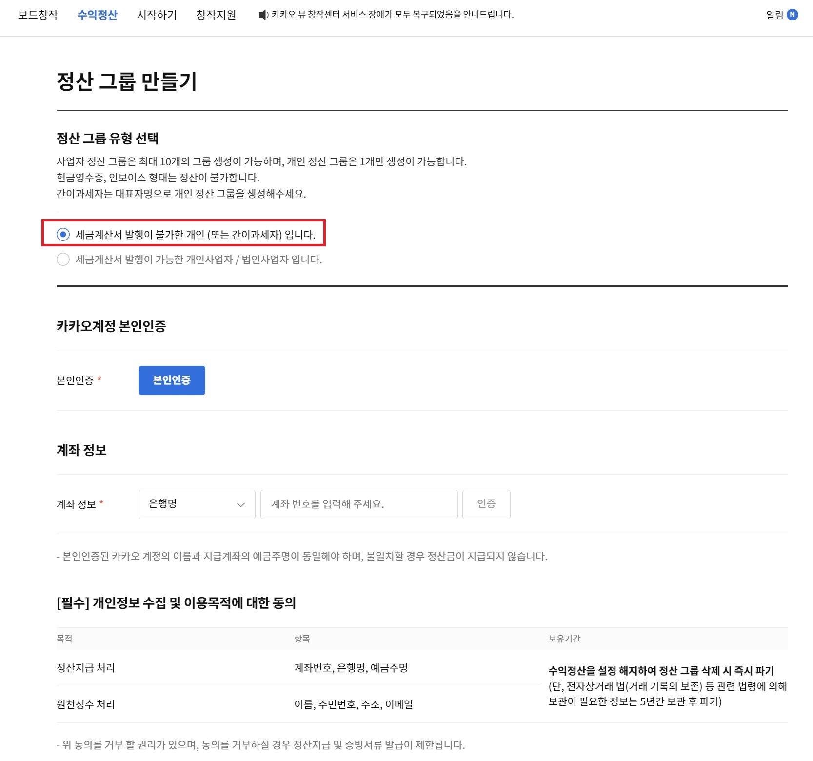 수익정산 -> 정산 그룹 만들기 -> 채널 선택