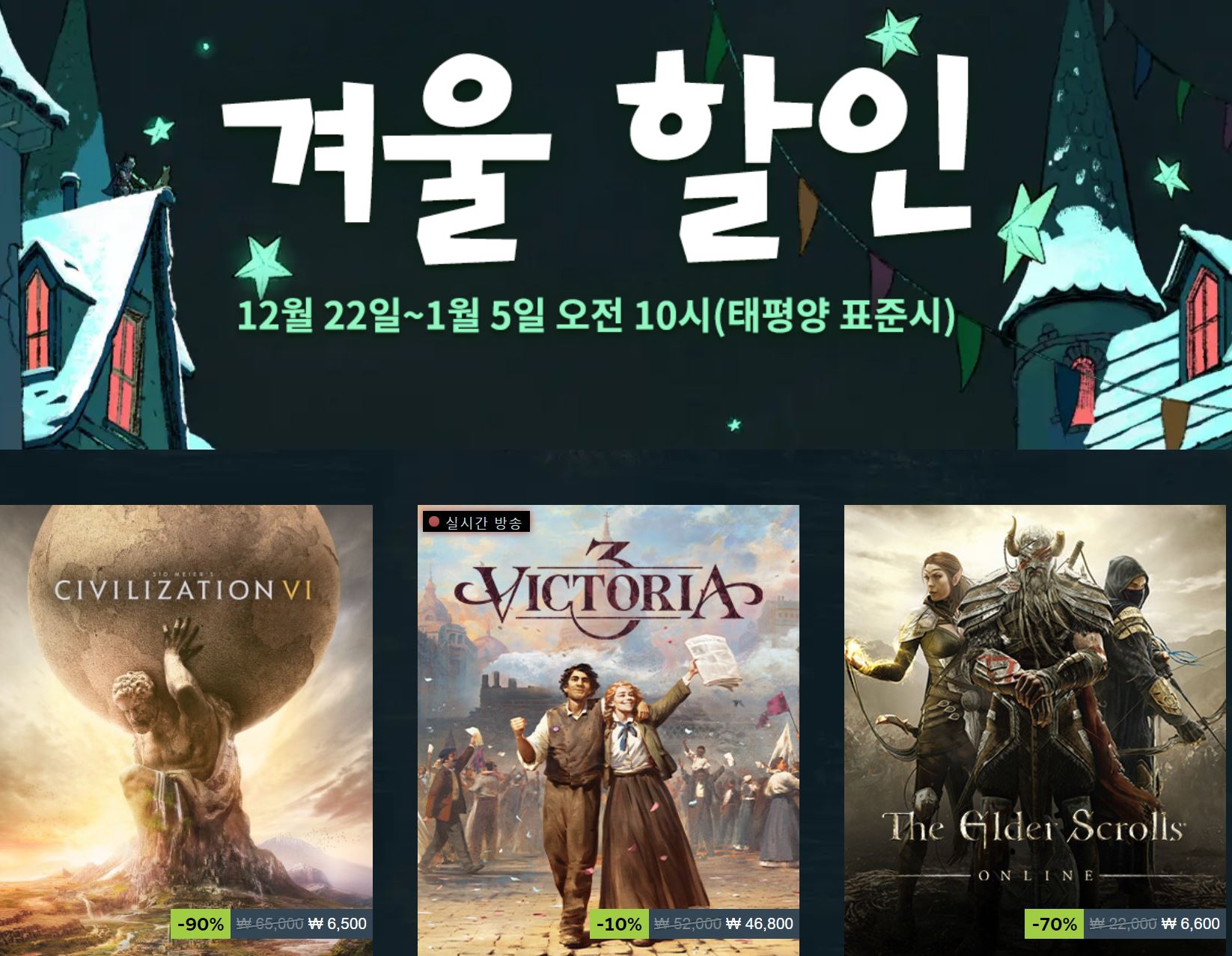 스팀 겨울 세일로 접속하면 할인 게임 리스트를 확인할 수 있습니다.