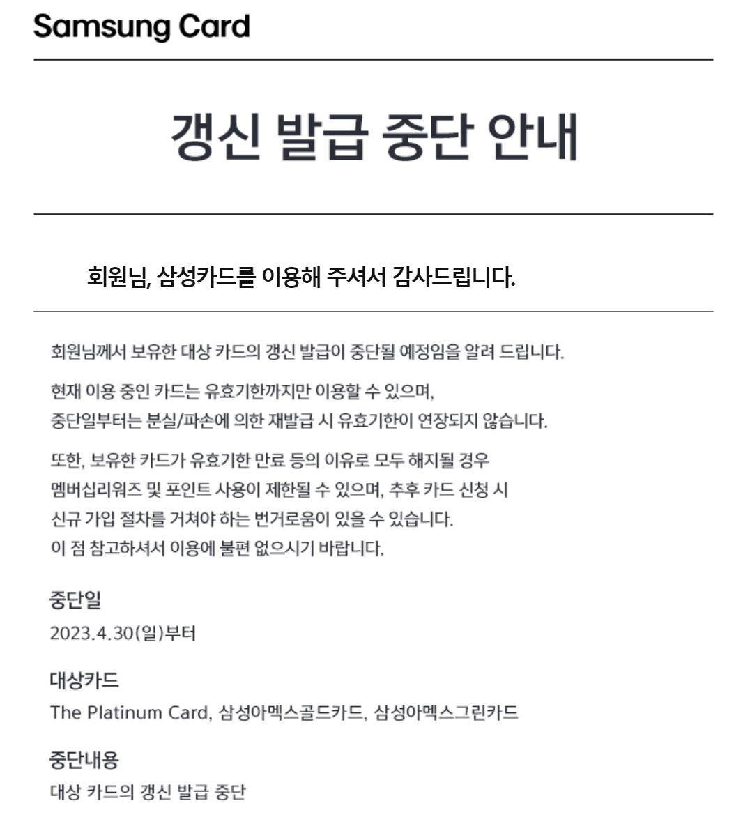 삼성 아멕스 더 플래티늄 카드의 갱신 발급 중단의 소식이 도착했습니다.