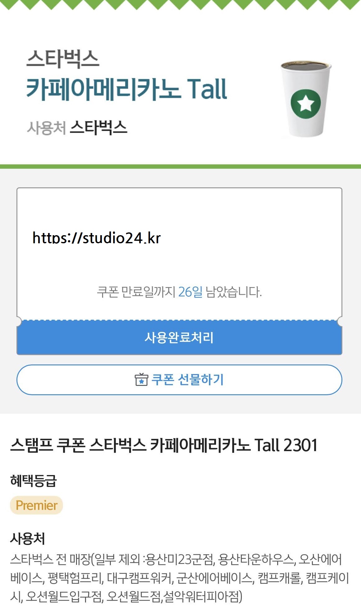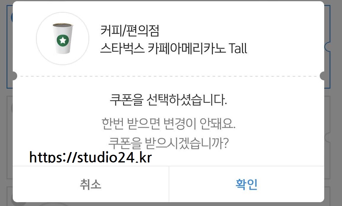 다양한 쿠폰이 준비되어 있고, 저는 스타벅스 카페아메리카노를 선택했습니다.