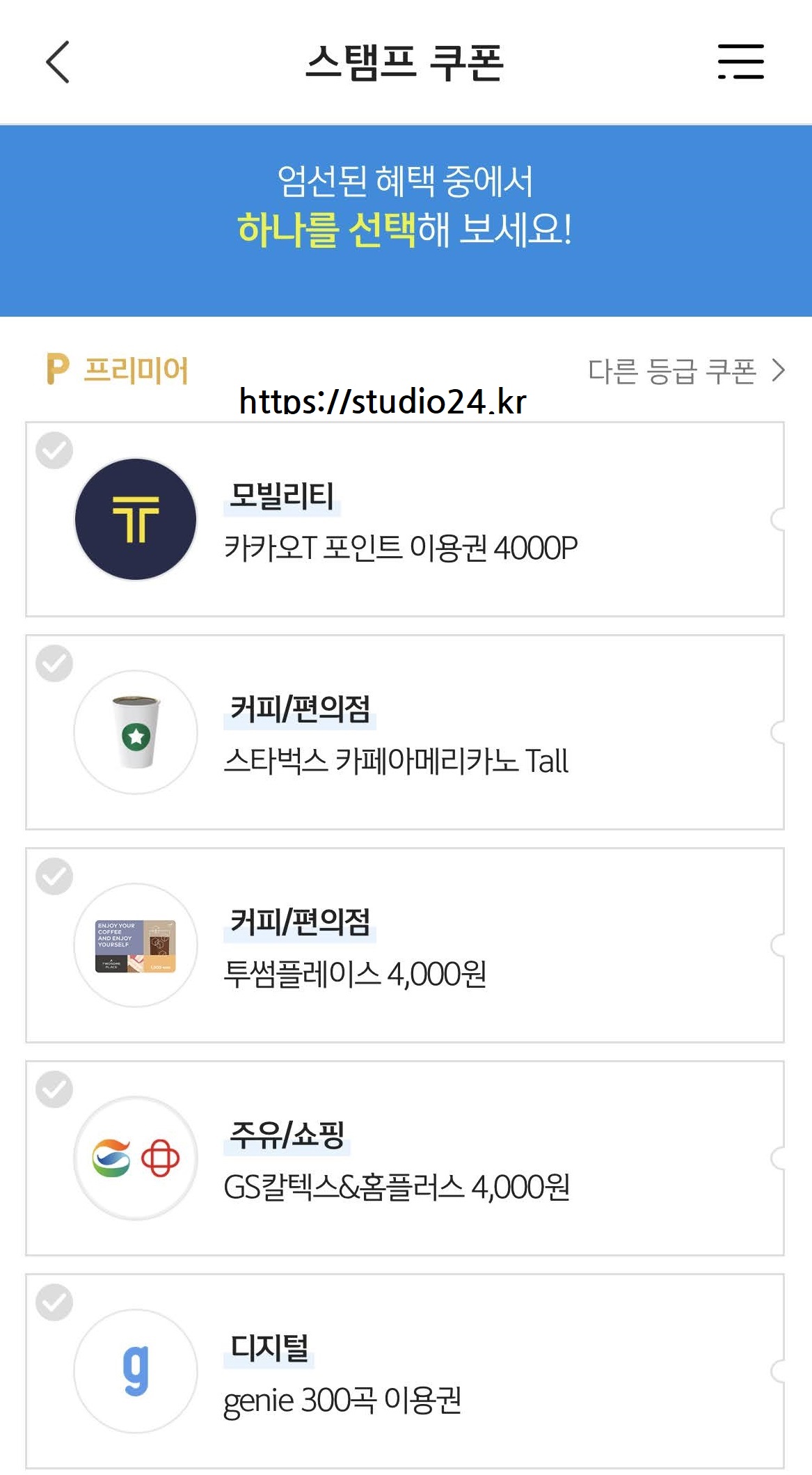 스탬프 하나는 다양한 상품의 쿠폰을 선택할 수 있어요.