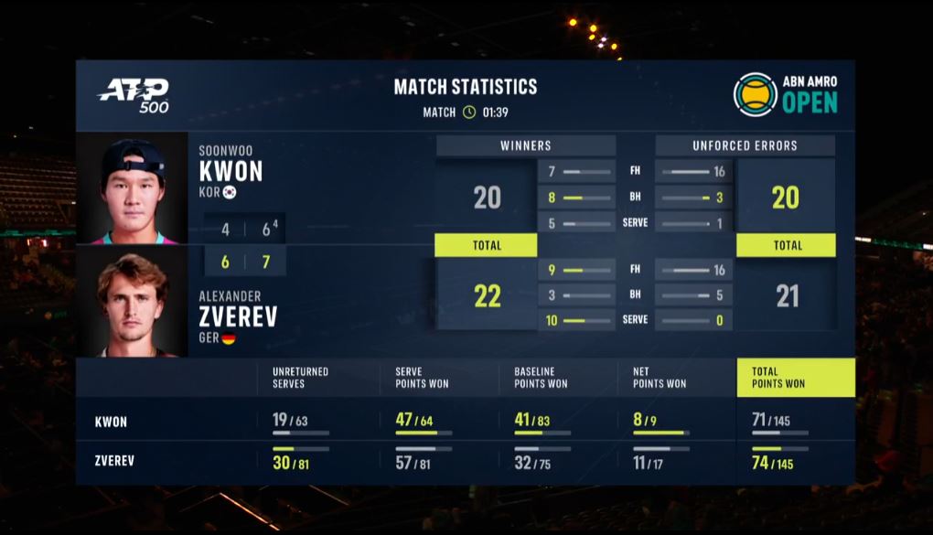 포핸드 대결에서는 대등하거나 월등한 경기를 진행했으나, 즈베레프의 강력한 서브에 계속 밀리는 모습을 보여주었습니다.