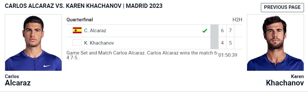 2:0 알카라스 승리로 8강은 종료되었습니다.