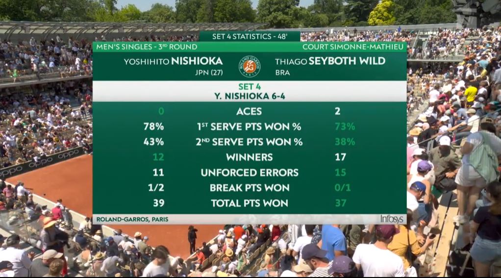 니시오카 선수가 4세트를 가져가며 2:2 동점을 이루게 됩니다.