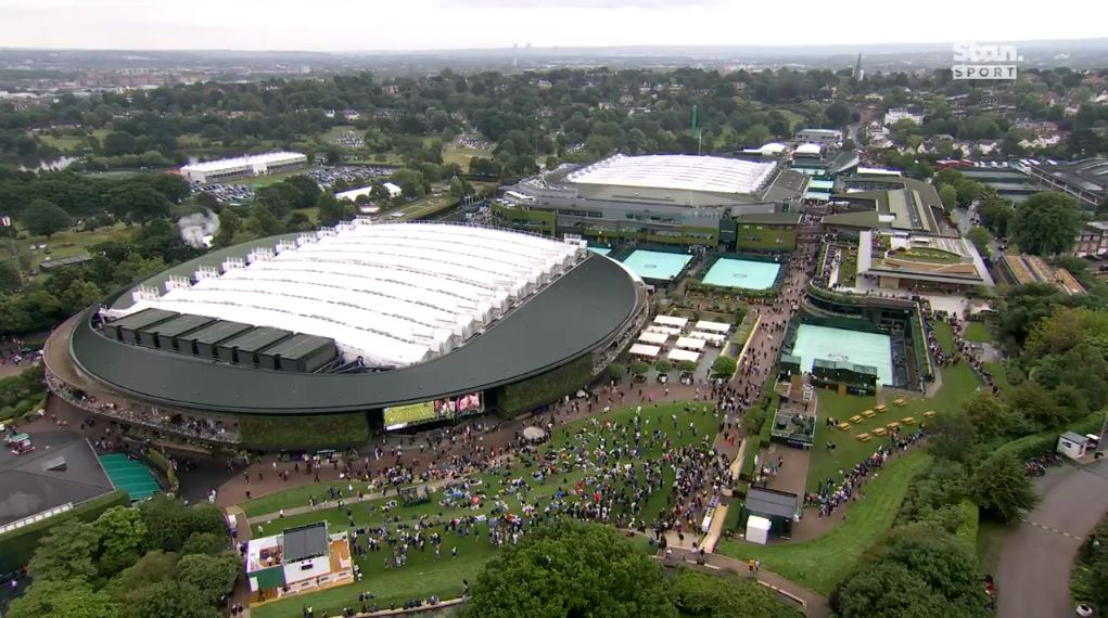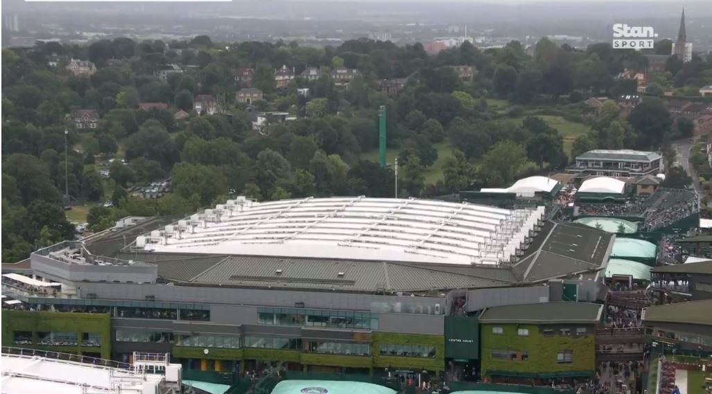 비가 오는 런던 윔블던 경기장의 모습니다.