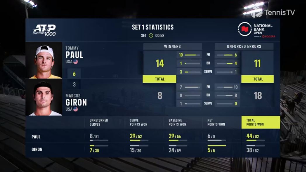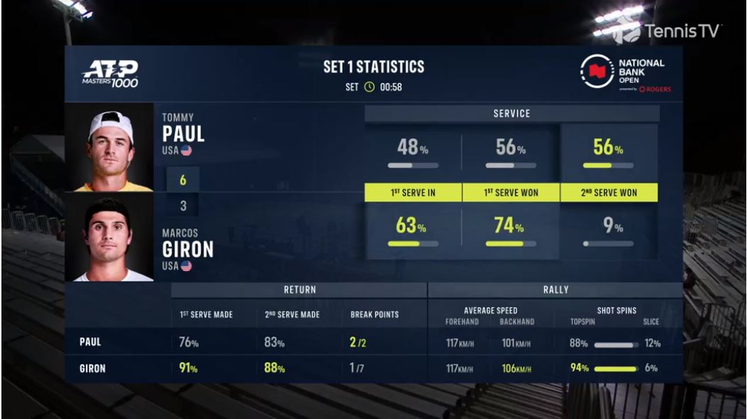 토미 폴 선수는 에이스 5개, 첫 번째 서브 득점 61%