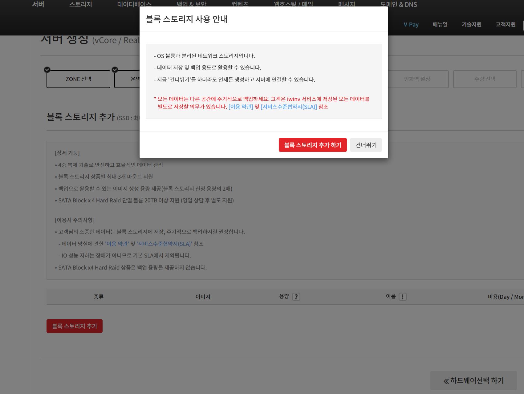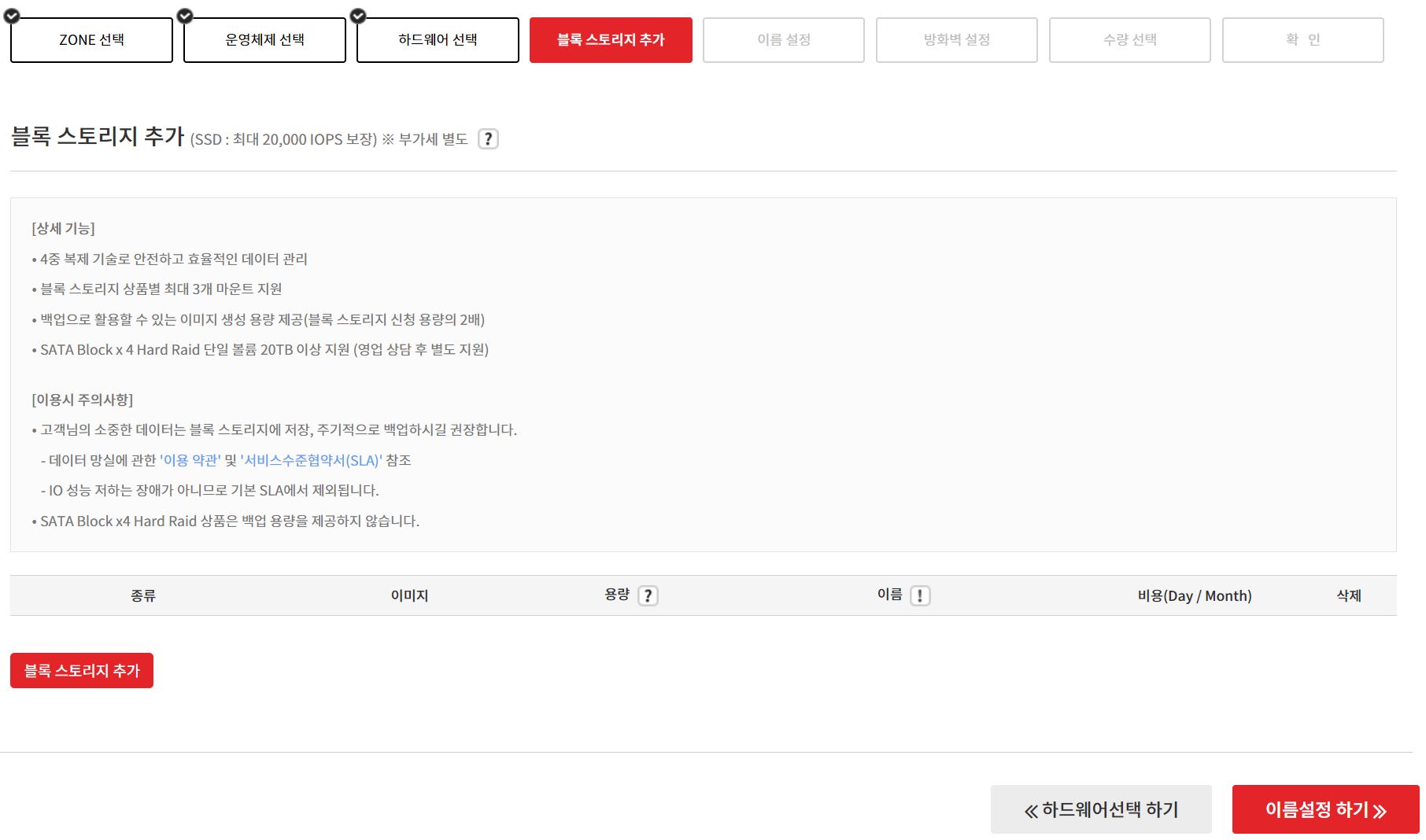 이름설정 하기를 클릭하면 블록 스토리지 사용 안내 문구가 확인됩니다.