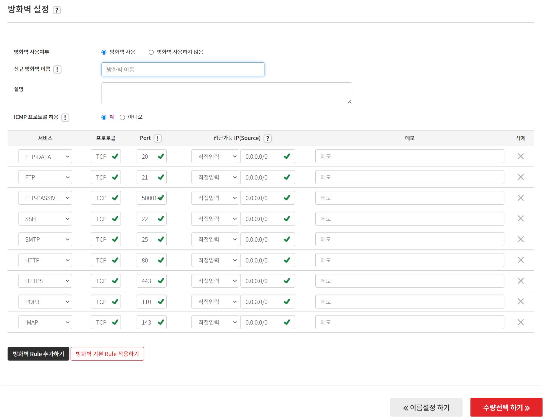 사용 클릭 후 방화벽 이름 입력하고 수량 선택 클릭